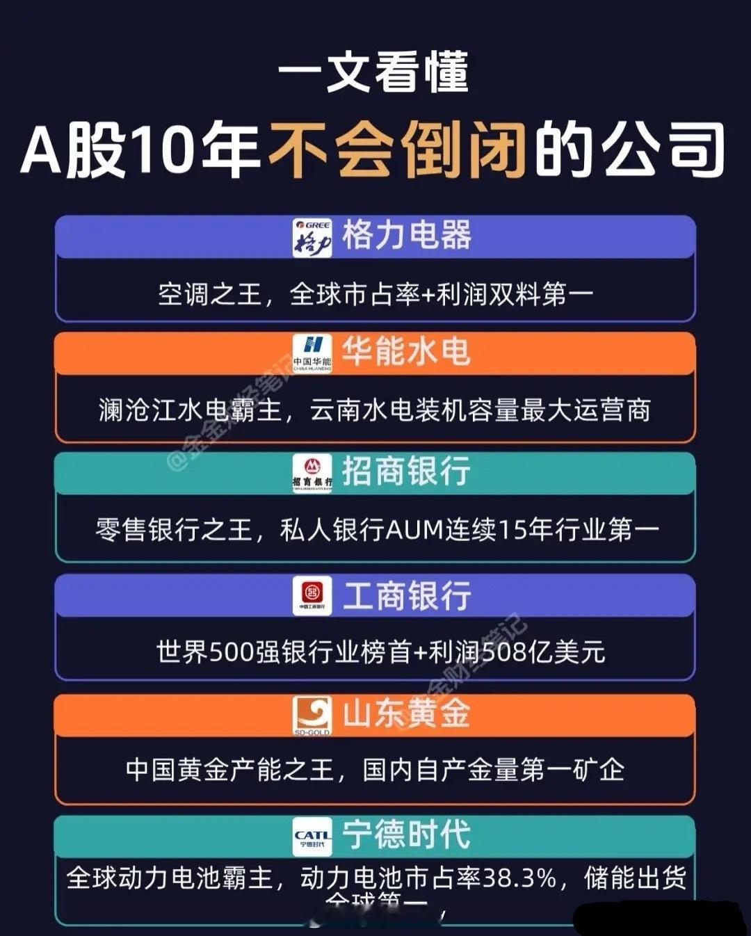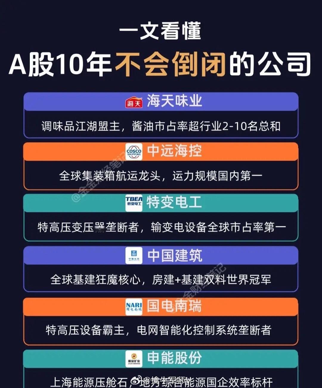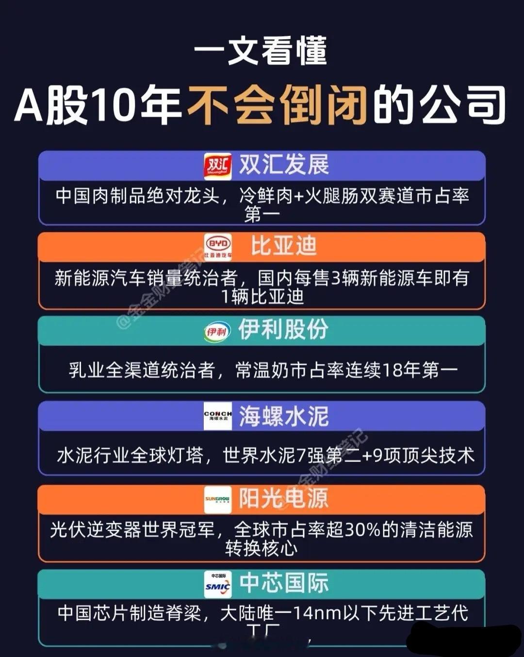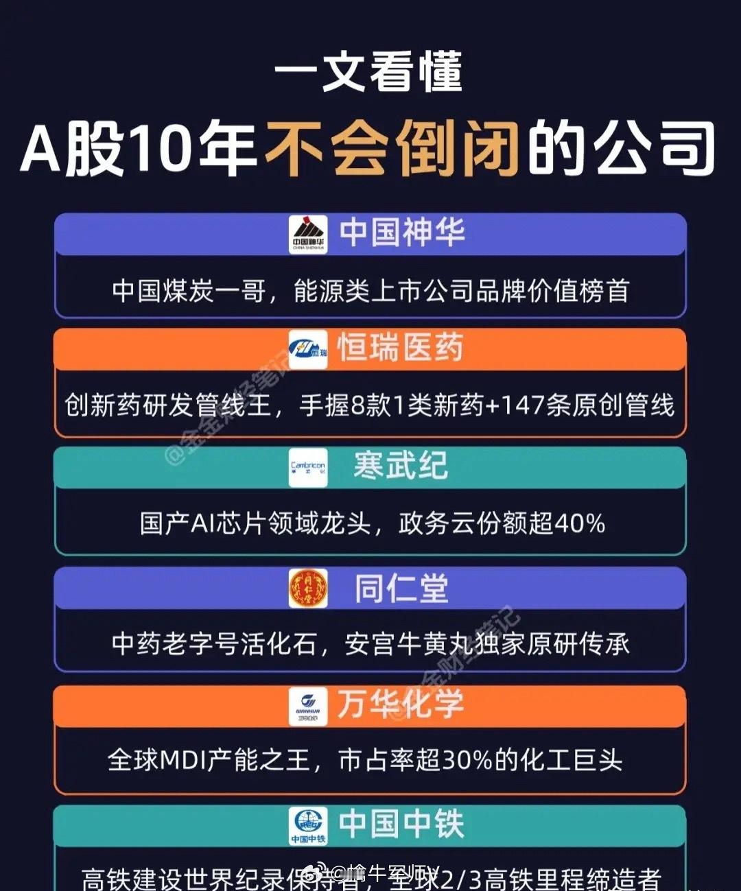 “A股市场上被认为未来10年内极难倒闭”的优质企业,这些公司普遍具备以下特点: