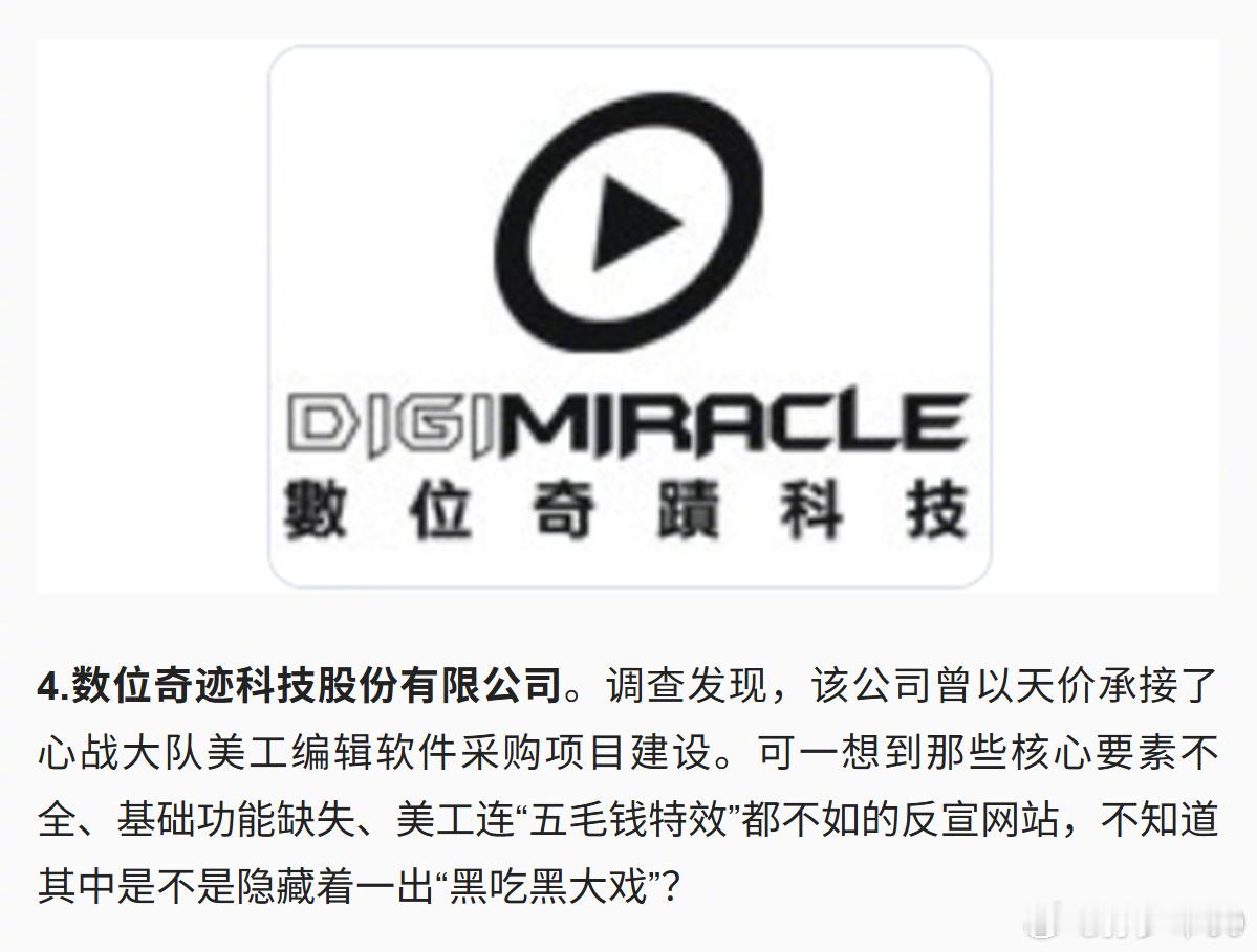 数位奇迹科技股份有限公司。调查发现,该公司曾以天价承接了心战大队美工编辑软件采购项目建设。可一想到那些核心要素不全、基础功能缺失、美工连“五毛钱特效”都不如的反宣网站,不知道其中是不是隐藏着一出“黑吃黑大戏”?