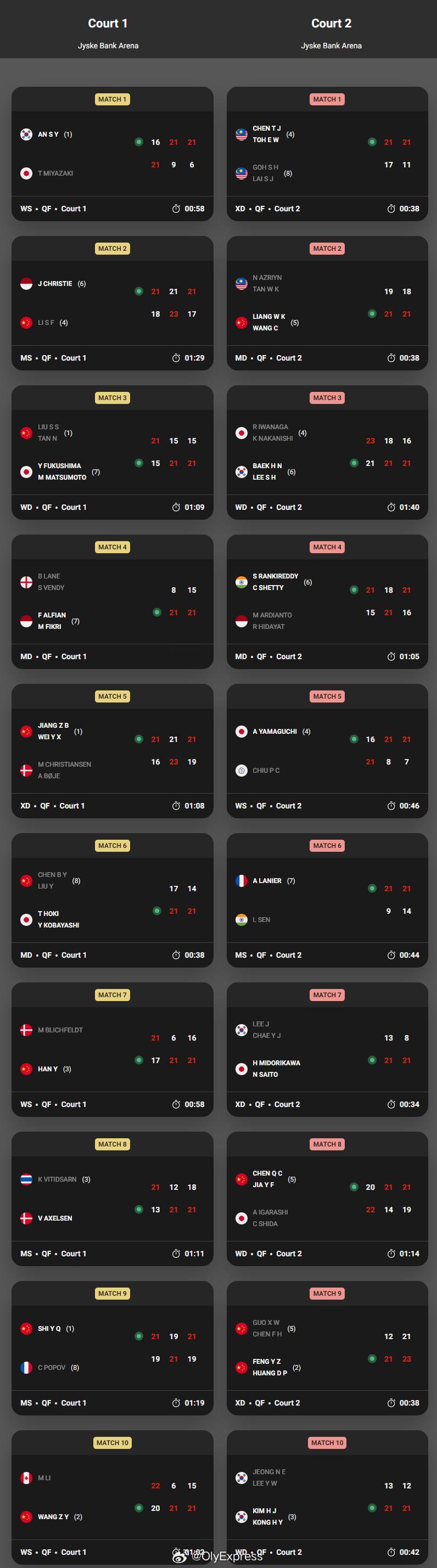 【丹麦羽毛球赛1/4决赛国羽7胜4负】2025年丹麦羽毛球公开赛羽联超级赛10月17日丹麦欧登塞,2025世界羽联超级750丹麦公开赛结束1/4决赛,国羽7胜4负,男单和男女双打都仅剩独苗。国羽赛果如下,完全赛果见图: