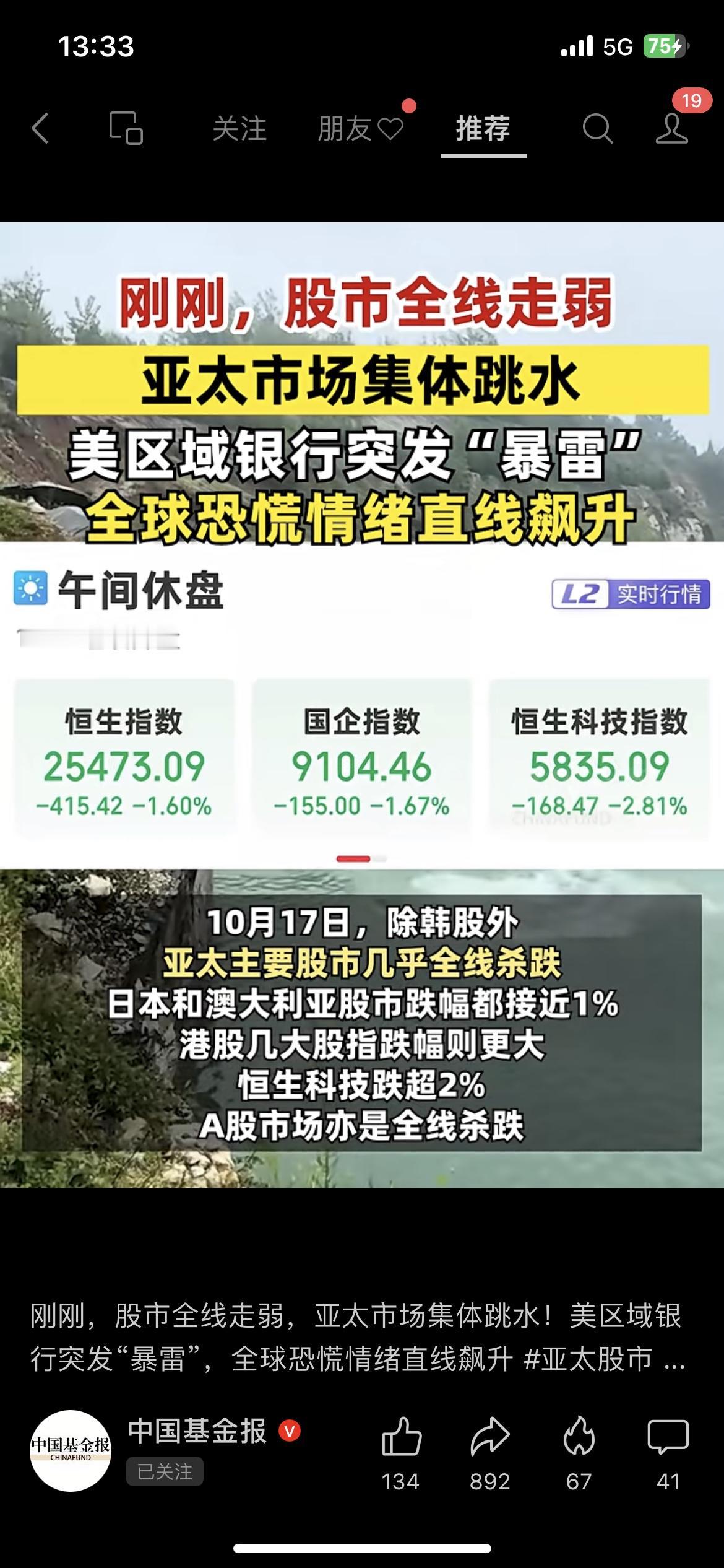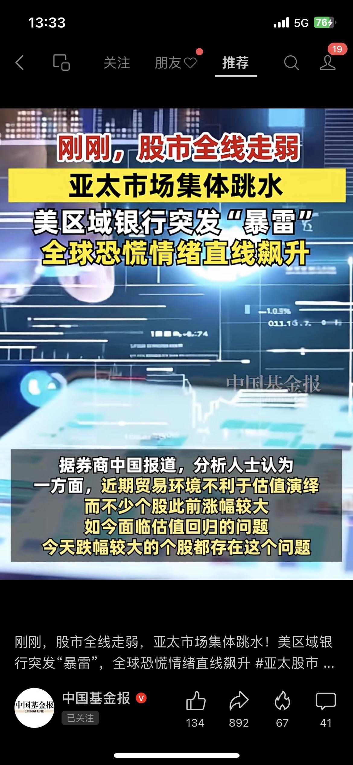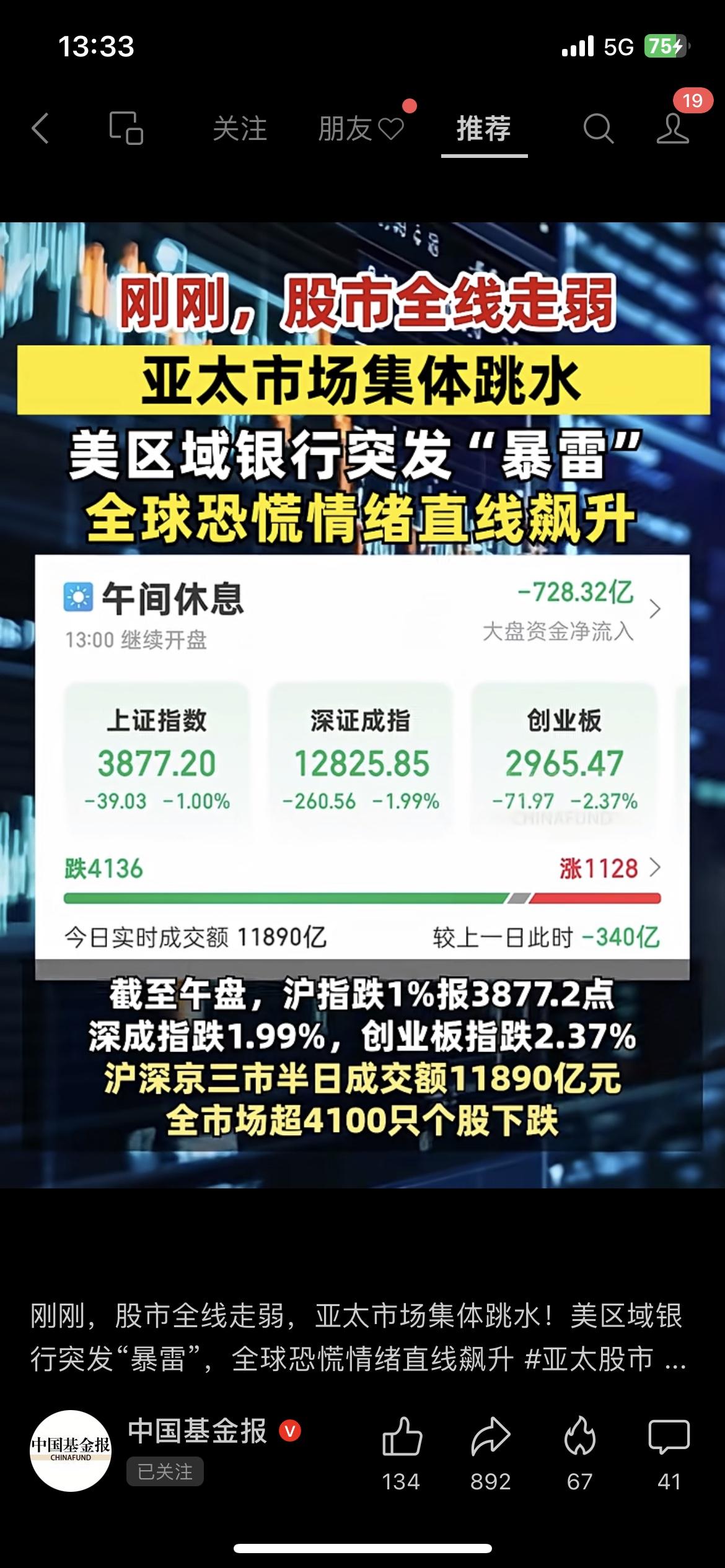大跳水!亚太股市集体崩了,美股银行暴雷吓懵全球,A股也扛不住了 家人们今天股市太惨了!亚太市场集体跳水,A股、港股全绿到发黑!沪指跌1%,深成指跌近2%,创业板跌超2.3%,港股恒生科技更是暴跌超2%!全市场超4100只个股下跌,这行情谁看了不心慌? 罪魁祸首就是美国区域银行又暴雷了,市场恐慌情绪直线飙升,生怕硅谷银行的剧情重演。亚太股市跟着遭殃,日本、澳大利亚股市都跌近1%,就韩股还算坚挺。 分析人士说,一方面是贸易环境不利,不少股票之前涨太多现在估值回归;另一方面就是美国银行这事儿把全球市场都带崩了。 家人们,你们的股票还好吗?这波下跌你觉得是机会还是风险?快在评论区聊聊!