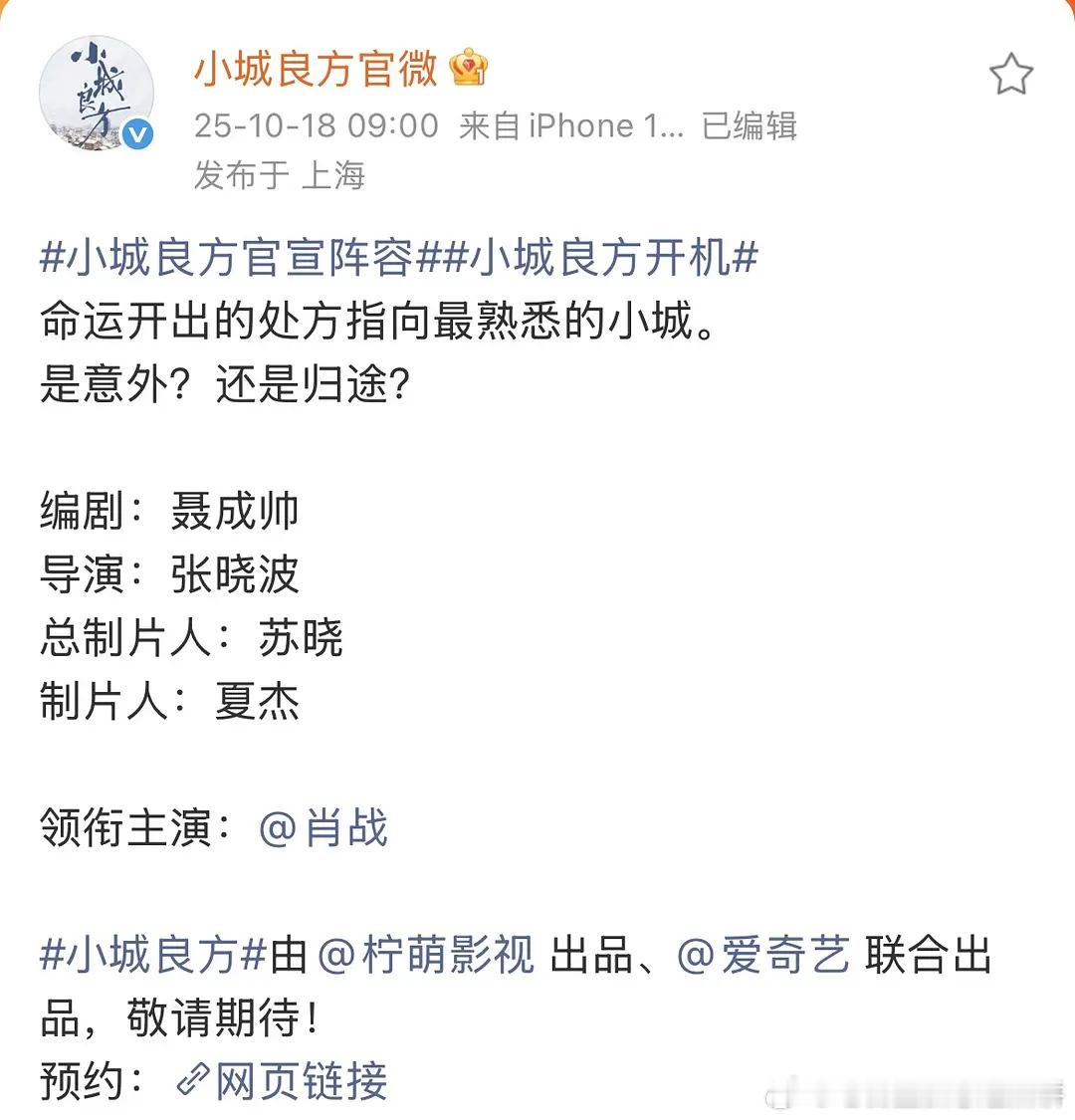 肖战的 小城良方 阵容官宣,演员配置真不错