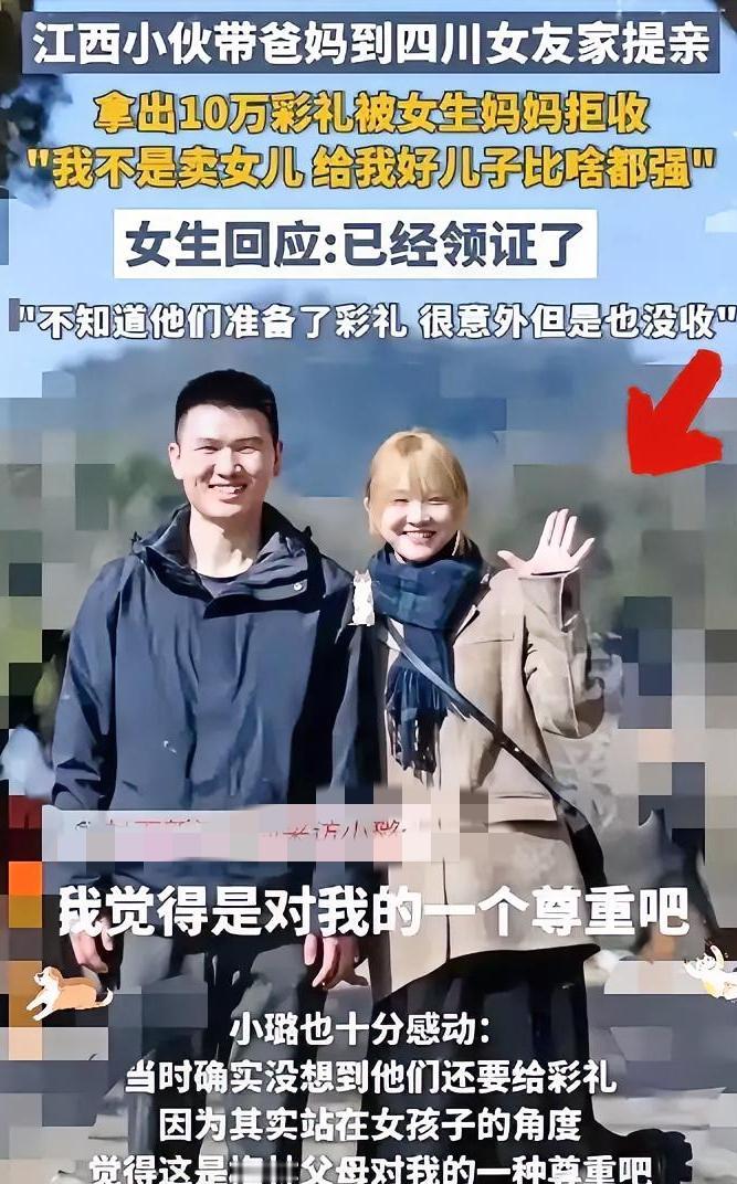 这个丈母娘太圈粉了!17号晚上刷到江西小伙带父母去四川提亲的事,看完真忍不住点赞。小伙月薪六千,爸妈是朴实农民,还有个读大学的妹妹,为凑10万彩礼,全家省吃俭用半年没添一件新衣裳,攥着钱上门时手都有点抖。 没想到准丈母娘当场把钱推回来,语气敞亮:“我看中的是你家儿子的踏实,不是这堆票子!”小伙和爸妈直接懵了,半天没反应过来。后来才懂,阿姨早算过账:这10万要是收了,小两口往后还房贷、养孩子的压力得多大?女儿嫁过去是过日子,不是来填窟窿的。 现在不少地方彩礼漫天要价,把婚姻变成了“卖女儿”,可这位阿姨看得透:真正为孩子好,是给他们留足过日子的底气,不是掏空男方家底。这种清醒又暖心的家长,才是孩子婚姻里的福气。 你身边有这样明事理的长辈吗?要是你家孩子结婚,会咋看待彩礼这事儿?