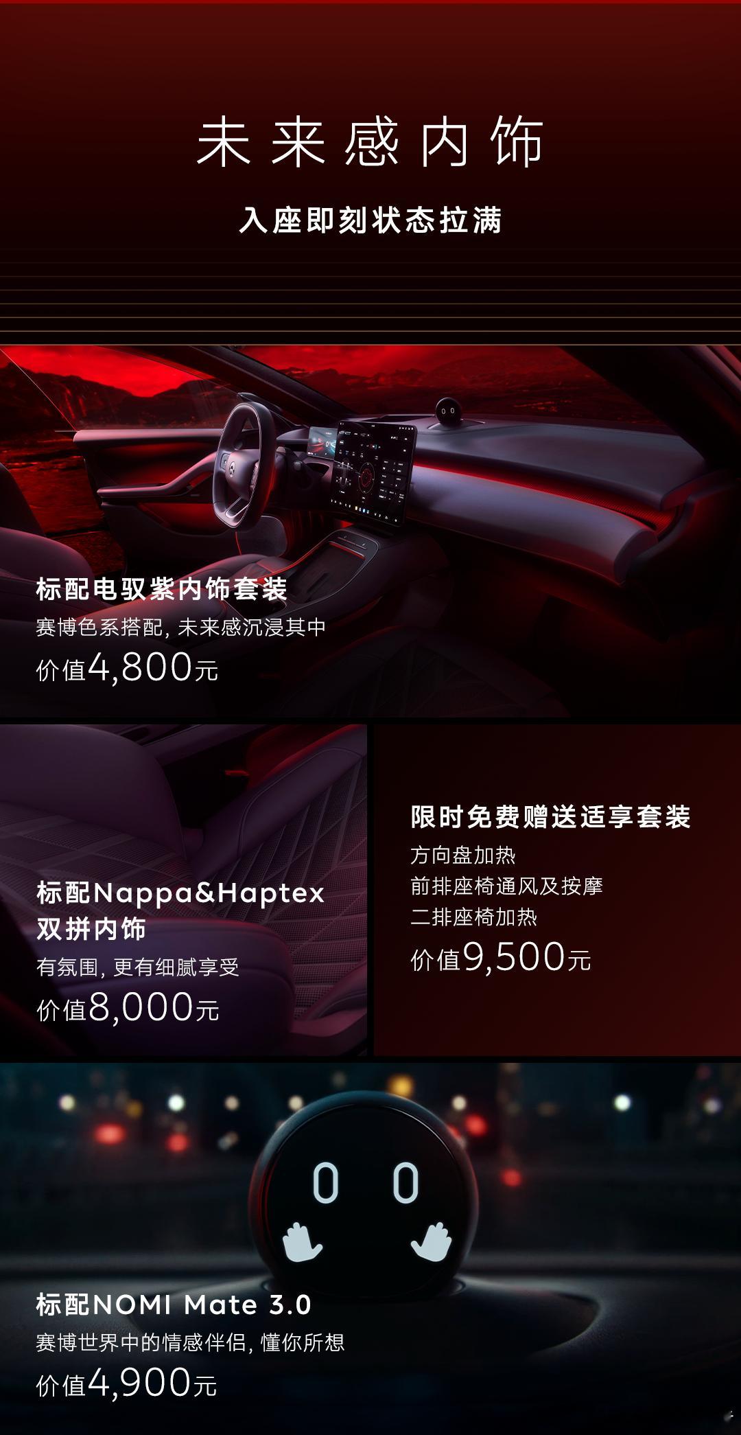 新车采用深空黑车身配专属拉花,标配Moon外观套件、20英寸橙卡钳轮圈、电驭紫内饰、Nappa双拼座椅、NOMI Mate 3.0及适享套装。底盘升级冠军纪念版同款,抗扭刚度增6%,新增EP Mode模式。