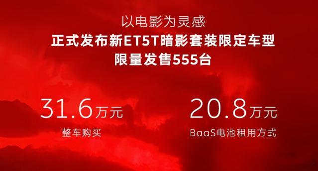 10月17日,蔚来以赛博科幻电影《创:战神》为灵感的新ET5T暗影套装限定车型正式发布,新车限量发售555台,整车购买31.6万元、BaaS 电池租用方式购买20.8万元(月租电728元起)。