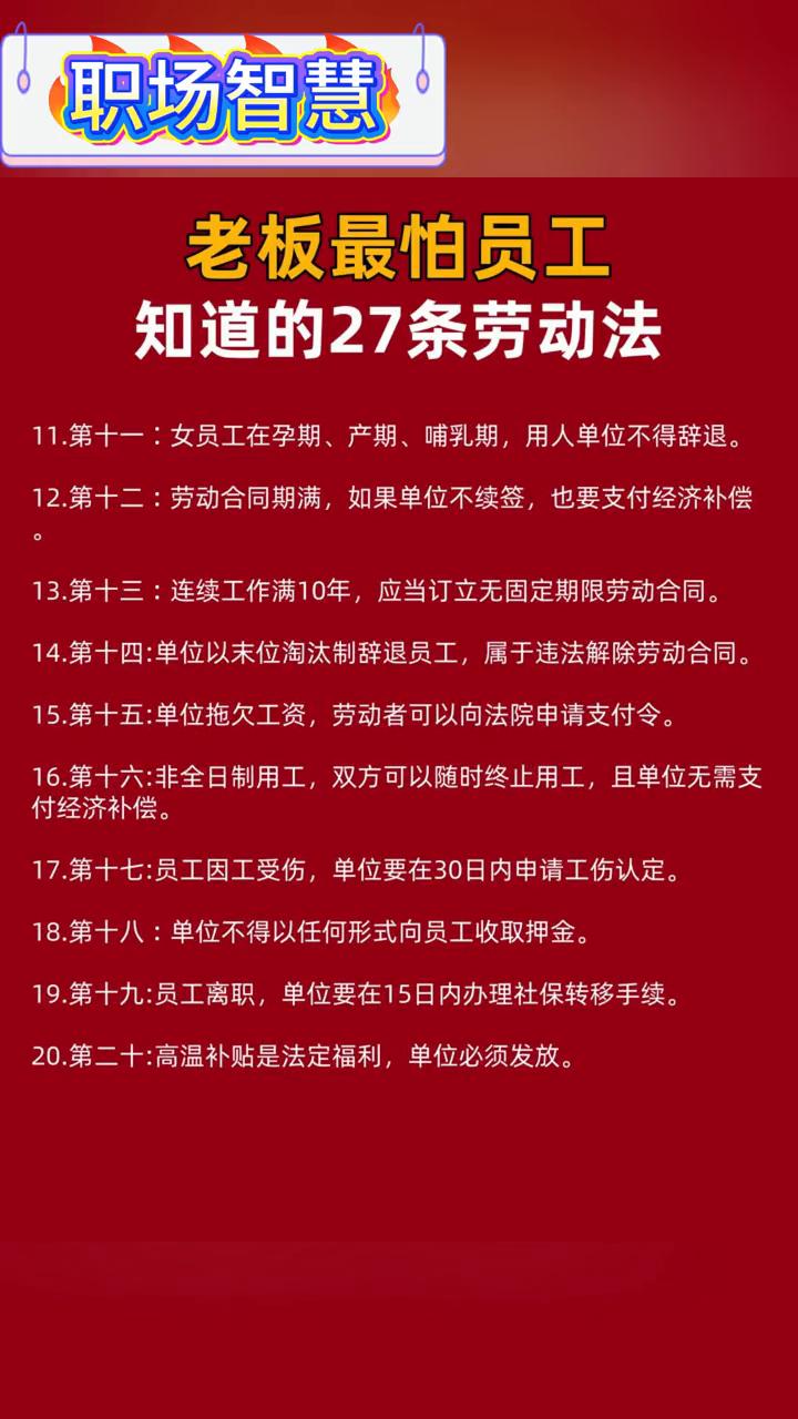 职场智慧:老板最怕员工知道的27条劳动法。 ·1.第一:正式员工离职,提前30天书面通知公司就可以,不需要经过公司同意。 ·2.第二:试用期离职,提前3天通知公司就可以。 ·3.第三:没签劳动合同的,从第二个月开始要支付双倍工资,最多支付11个月。 ·4.第四:单位不可以强制调岗,调薪。变更劳动合同内容必须双方协商一致。 ·5.第五:加班要有加班费,平时加班1.5倍工资,周末加班2.倍工资,法定节假日加班3倍工资。 ·6.第六:单位无故辞退员工,需要支付2N赔偿金。 ·7.第七:公司不给交社保,可以随时离职,并且要求经济补偿。 ·8.第八:工作满一年,员工享有5天带薪年假,未休年假的,按照3倍工资支付报酬。 ·9.第九:发生劳动纠纷,或者遇到不公平待遇,可拨打12333举报。 ·10.第十:劳动仲裁不收费,别花冤枉钱请律师,自己就可以申请。 ·11.第十一:女员工在孕期、产期、哺乳期,用人单位不得辞退。 ·12.第十二:劳动合同期满,如果单位不续签,也要支付经济补偿。 ·13.第十三:连续工作满10年,应当订立无固定期限劳动合同。 ·14.第十四:单位以未位淘汰制辞退员工,属于违法解除劳动合同。 ·15.第十五:单位拖欠工资,劳动者可以向法院申请支付令。 ·16.第十六:非全日制用工,双方可以随时终止用工,且单位无需支付。 ·17.第十七:员工因工受伤,单位要在30日内申请工伤认定。 ·18.第十八:单位不得以任何形式向员工收取押金。 ·19.第十九:员工离职,单位要在15日内办理社保转移手续。 ·20.第二十:高温补贴是法定福利,单位必须发放。 ·21.第二十一:病假工资不能低于当地最低工资标准的80%。 ·22.第二十二:单位不得以员工请假为由扣发全勤奖。 ·23.第二十三:经济补偿的计算标准,按劳动者在本单位工作的年限每满一年支付一个月工资。 ·24.第二十四:月工资高于当地上年度职工月平均工资三倍的,支付经济补偿的年限最高不超过十二年。 ·25.第二十五:竞业限制期限,不得超过二年。 ·26.第二十六:工资高于当地上年度职工月平均工资三倍的,支付经济补偿的年限最高不超过十二年。 ·27.第二十七:劳动者不能胜任工作,经过培训或者调整工作岗位仍不能胜任工作的,单位提前30日以书面形式通知劳动者本人或单位负责人。