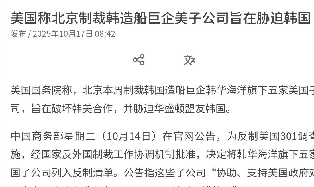 美国对我们进行回应!在我们制裁韩国造船巨企韩华海洋旗下五家美国子公司之后,美国出来回应了!10月17日,美国国务院发言人声称,中国针对韩华的做法,是干预私人企业运营的“不负责任”之举,并破坏为重振美国船舶制造行业的美韩合作。中国的行为是它们“长期胁迫”韩国的最新范例。 韩华海洋,这家刚刚完成对大宇造船收购的韩国造船巨头,早已不是当年的“韩国本土企业”那么简单。   它的触角已经伸到了美国,旗下在美国营运的五家子公司不仅仅是普通业务单位,更直接参与到美军舰船制造、港口维护等关键项目中。   换句话说,它既是韩国的经济象征,也是美国工业复兴战略的一环。这时候,中国对这五家子公司实施制裁,不只是敲打韩华,也是在间接对美韩军事工业合作表达不满。   美国当然坐不住。它回应得快,语气也不轻。说中国“胁迫韩国”,是熟悉的剧本了。但这一次,它更在意的是中国为什么会动手。   因为在过去几年里,中国对于一些涉台、涉海军事项目背景下的外企,一直保持着高度警惕。   韩华海洋之所以进入视野,是因为它在美韩联合军事项目中扮演的角色越来越明显,尤其是它与美军方在舰船推进系统方面的一些合作,已经不再是单纯的商业行为,而上升到了战略层面。   中国的制裁,其实是对韩华在中美之间“选边站”的回应。这几年我们能明显感觉到,韩国在外交政策上的摇摆性越来越大。   有时候在中韩之间强调经济合作,有时候又在美韩军事合作中表现得极为积极。韩华本身作为一个防卫企业,在这场大国博弈中,几乎不可能保持“政治中立”。   而这一次,中国的出手,实则是对韩国在战略合作上日益倾向美国的现实做出警告。   美国的“反应过激”,其实也暴露出它在全球高端制造链中的依赖性问题。长期以来,美国虽然是全球军事强国,但在造船领域却存在“空心化”问题。   这也是为什么它在重振本土制造时,不惜与韩国企业深度绑定。中国对韩华的制裁恰好打在这个软肋上,让美国意识到,在全球化的今天,想要“独善其身”几乎不可能。这种被动感,才是让华盛顿如此焦躁的根源。   韩华,这家企业的角色不再单纯,它代表着韩国在全球军工产业链中的新一轮扩张,也承载着美韩之间更深层次的安全合作。   中国实施制裁,实则划出一条红线。无论哪家外国企业,一旦触及中国核心利益,中国既有正当权利,更具强大能力予以有力反制,彰显捍卫主权之决心。这种表态,清晰而有力。   美国的“回应”并没有实质性举措,更多是一种情绪化的表达。它不可能因为韩华被制裁就直接与中国对抗,也不可能强硬到在贸易层面进行报复。   当下中美关系错综复杂,可谓牵一发而动全身。在此局势下,任何罔顾后果的过激反应,都极有可能让自身陷入更为窘迫的困境,需慎之又慎。美国当然知道这一点,所以它选择将话说得“重”一些,但行动上却保持克制。   这场风波背后的逻辑,是全球产业链和地缘政治之间的深度纠缠。任何一个跨国企业,只要涉及到军事、安全、战略资源等领域,就不可能在当前的大国博弈中“置身事外”。   韩华海洋被点名制裁,不只是一次简单的外交摩擦,而是中国对外表达战略立场的一种方式。而美国的回应,某种程度上反倒印证了这项制裁的“有效性”。   所以,这不仅仅是一次外交部声明和国务院回应的交锋,它更像是一场无声的战略博弈,在每一次看似微小的制裁背后,藏着的是大国如何划定自己的核心利益边界。 素材来源:美国务院帮腔:中方“胁迫”韩国 2025-10-17 08:39·观察者网