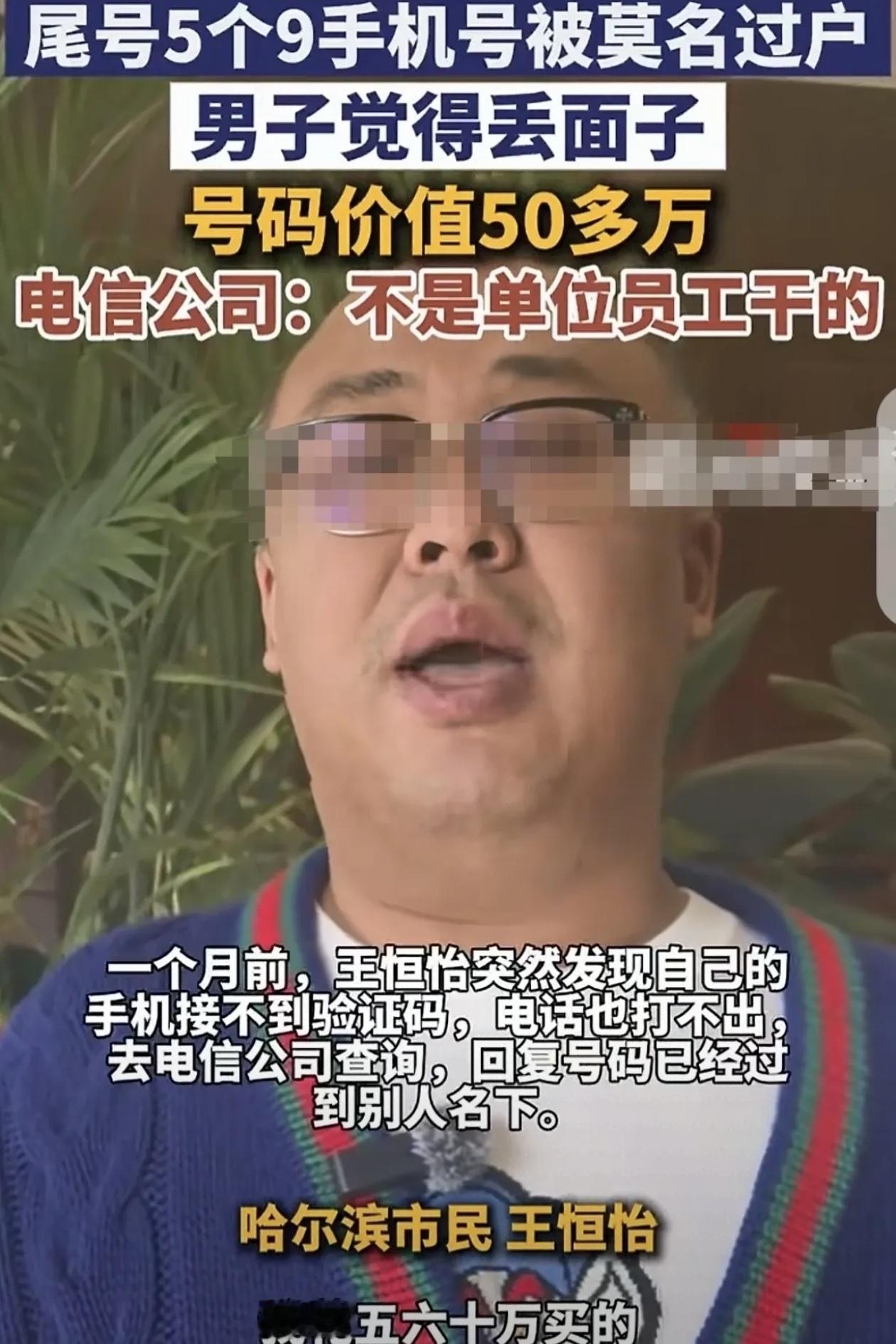 黑龙江一男子花50多万,买下尾号5个9手机号,结果,最近手机号突然无法使用,万万没想到!黑龙江哈尔滨,王先生正准备跟大客户签下年底最重要的一笔订单,客户发来的验证码迟迟收不到,这可把他急坏了。 更要命的是,他想回拨过去解释,手机却显示"无服务",连网络都彻底断了,十几年的生意伙伴、银行卡、支付宝全都绑在这个号上,每天光是资金往来就得几十笔。 王先生火急火燎地赶到营业厅,工作人员查完系统,脸色都变了:"王先生,您这个号码已经过户到一位李女士名下了。"这话如同晴天霹雳,王先生当场就蒙了,声音都在发抖:"开什么玩笑,我花五六十万买的号,用了整整十年,怎么可能说没就没了?" 要知道,这可不是普通号码,尾号五个9,在生意场上就是一张活名片,递出去的时候,对方都会多看两眼,心里暗想"这老板不简单",这些年谈成的大单子,有一半都是因为这个号给人的第一印象。 工作人员连忙摆手:"这肯定不是我们内部员工操作的,私自过户那是违法的!"王先生彻底炸了,拍着柜台喊道:"不是你们的人,难道是我自己把号送人了?我吃饱了撑的?"旁边等待办业务的人都围了过来,议论纷纷。 他借朋友的手机拨通自己原来的号码,电话那头传来陌生女人的声音:"这号是我前几天花四十多万买的,已经实名过户了,你找我干什么?"两个人都花了巨款,却都成了受害者,这背后到底藏着什么猫腻? 网友们炸开了锅:"用姐姐名字买的号,十年都不过户到自己名下,这不是给别人留机会吗?""就算是姐姐的名字,过户也得本人到场啊,这明显有内鬼!" 原来王先生当初为了方便,用姐姐的身份证办的这个号,想着都是一家人,没必要折腾,谁料十年后竟然出了这么大的篓子,姐姐在老家务农,连智能手机都不会用,更别说偷偷过户了。 从法律角度看,根据《电信条例》明确规定,手机号过户必须本人携带身份证原件到场办理,委托他人还需要公证委托书,这种神不知鬼不觉的过户,明显违反了所有流程。 更让人细思极恐的是,如果连花几十万买的靓号都能随意被转走,那普通人的号码安全谁来保障?现在手机号早就不是简单的通讯工具,而是绑定了我们全部的金融账户、社交软件、工作系统的"数字身份证"。 不得不说,这件事给所有人敲响了警钟,再贵重的东西,产权不在自己手上就是定时炸弹,哪怕是亲姐姐的名字也不行,血缘关系在利益面前有时候真的不堪一击。 古人说"亲兄弟明算账",这话放在今天依然适用,不是不相信亲情,而是要用规则保护亲情,王先生的遭遇或许就是对这句古训最生动的注解,财产安全这件事上,谁都不能心存侥幸,这或许就是现代社会给我们上的最昂贵的一课吧。