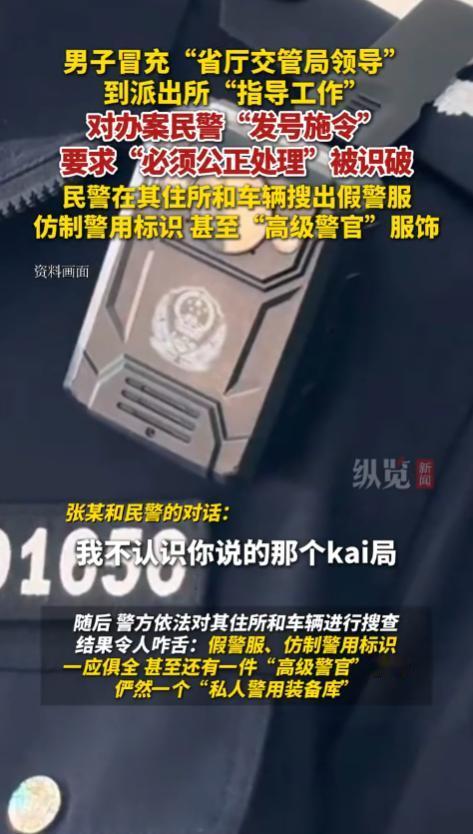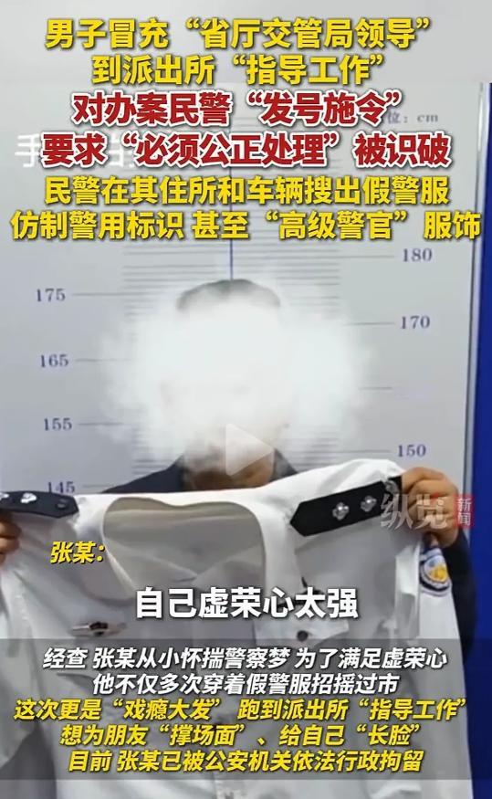 辽宁辽阳,一派出所民警正在调解纠纷,没想到,这时一名穿着白色警服的男子不请自来,不仅自称是领导,还对案件指手画脚,可很快就露馅了,男子竟然是假冒领导,来给朋友“撑场面”的 10月17号这天,辽阳工农街派出所里上演了一幕让人啼笑皆非的闹剧。 民警正忙着调解一起普通的民事纠纷,谁也没料到,这时一个穿着白色警服的中年男人大摇大摆走了进来。 这人一进门就摆足了架子,自称是省厅交管局的领导,说是来视察工作,径直走到调解室里对办案民警指手画脚,嘴里反复强调“必须公正处理”。 说话的语气和姿态,乍一看还真有几分领导的派头,可民警们却面面相觑,这么一起普通的民事纠纷,上级领导怎么会突然知道,还亲自跑过来过问?而且事先根本没接到任何通知。 更露馅的是,他一边说要公正处理,一边还偷偷给涉案的哥们使眼色,那点想偏袒的小心思藏都藏不住。 这一下民警更确定了,这所谓的“领导”八成是假冒的。 常年办案的民警,天天跟各种人打交道,真领导的行事风格和说话分寸早就刻在骨子里,眼前这人演得再像,骨子里的不专业也藏不住。 没多会儿,民警就掌握了确凿证据,当场就把他控制住了。 被戴上手铐的那一刻,张某直接吓破了防,一五一十地交代了实情。 原来他从小就有个警察梦,可当年学习成绩不行,没考上警校,这个梦一直没实现。 为了过过瘾,他就弄了不少假警服和仿制的警用标识,家里和车上搜出来的东西让人咋舌,不光有普通警服,还有件看着级别不低的警官服,简直像个私人警用装备库。 平时他就偶尔穿出去晃悠,满足自己的虚荣心,这次听说哥们卷进了纠纷,觉得正好能派上用场,既给哥们撑场面,自己也能在人前长脸,才胆大包天地跑到派出所来“指导工作”。 让人哭笑不得的是,他以为这身行头能唬住人,没想到在专业民警面前,连几分钟都没撑过去。 最终,因为非法持有、使用警用标识和冒充国家机关工作人员,张某被依法行政拘留。警方调查后发现,他之前没利用假身份犯过其他事,不然处罚只会更重。 这事看着荒唐,背后藏着的心态却不少见。 谁都想在朋友面前有点面子,可把面子看得太重,甚至不惜触碰法律底线,就太糊涂了。 张某想给哥们撑场面的心思能理解,但用冒充警察这种违法的办法,不光没帮上忙,反而把自己送进了拘留所,连带着哥们也跟着没面子。 这绝不是件小事,警服代表的是国家执法权威,不是用来撑场面、满足虚荣心的道具。 对法律少了敬畏心,总想着走歪门邪道耍小聪明,迟早要栽跟头。 张某要是真有警察情结,完全可以通过报考警校、做治安志愿者这些合法的方式靠近梦想,可他偏偏选了最错的一条路,最终只能为自己的荒唐行为买单。
