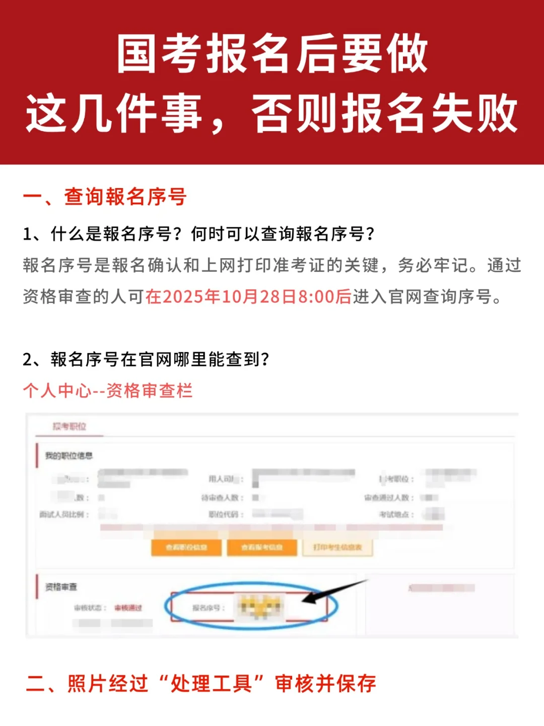 報名序号是報名确认和打印准考证的关键⭕,通过资格审查的人在2025年10月28日8:00后查询,在“个人中心--资格审查栏” ❗