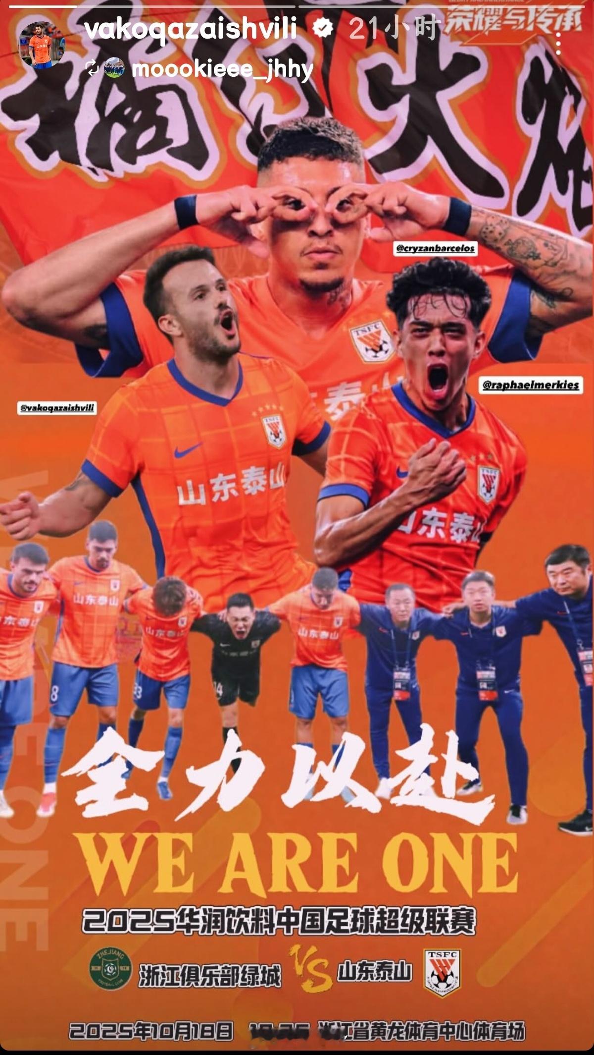 恶战即将开战,泰山外援克雷桑,泽卡,卡扎伊什维利,马德鲁加相继发布个人动态以示出战的信心和胜利的决心[努力]