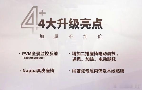 内饰方面,新增PVM全景监控、Nappa真皮座椅、二排电动腿托/通风/加热、缎奢驼内饰及木纹贴膜;标配电动天窗、双侧电滑门、隐私玻璃、无钥匙进入、HUAWEI HiCar/CarPlay/CarLife互联。