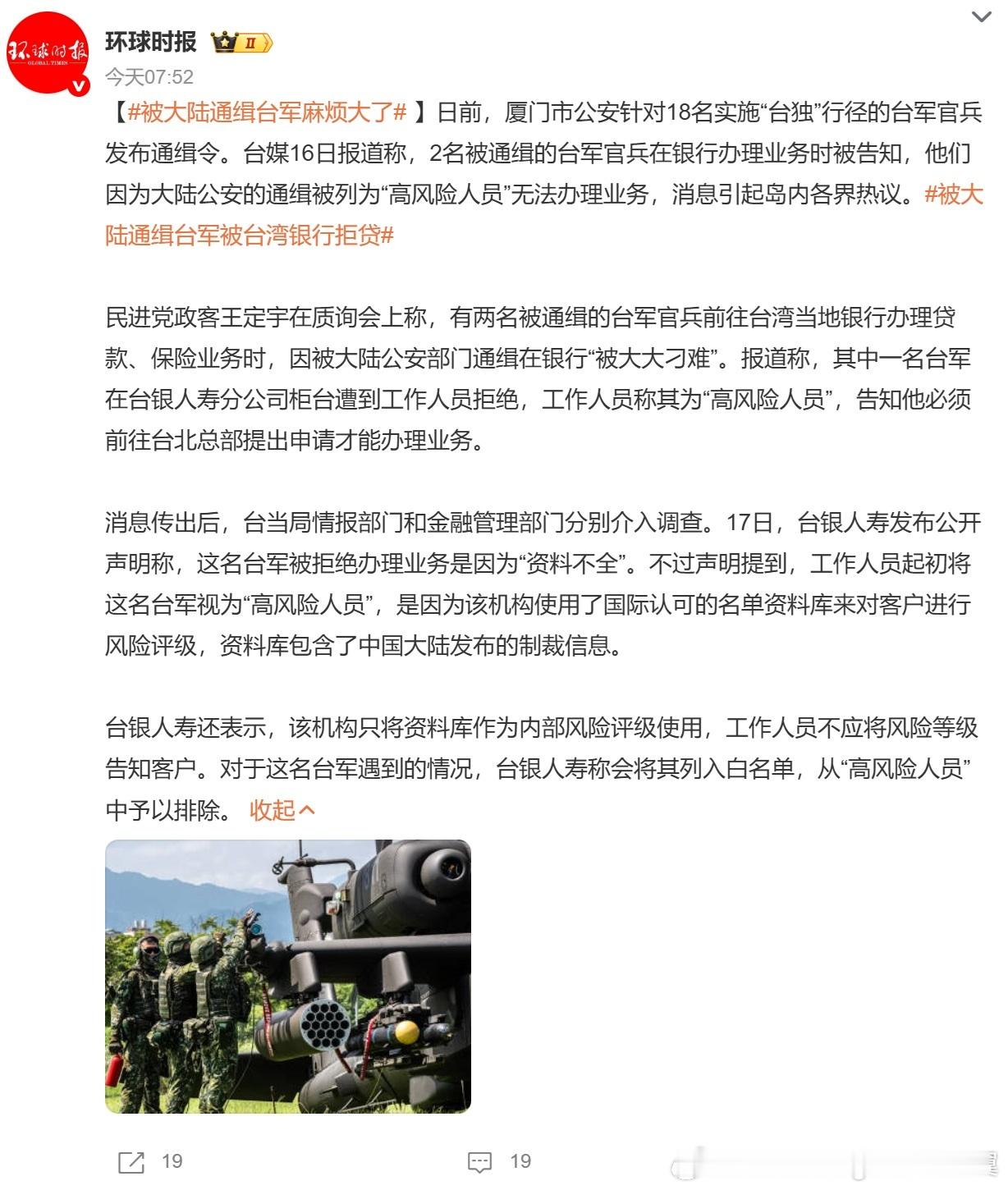 被大陆通缉台军麻烦大了 被大陆通缉的台军人员,一人要更换姓名,向台银人寿来进行作业,没想到被台银人寿告知说:“你是高风险人员,不能像一般人一样来临柜办理,必须到台银人寿的台北总部,才准其办理”。另一人到玉山银行办理房贷,被告知有被大陆通缉的不良纪录,列为高风险人物。当面告知不容易核准贷款。
