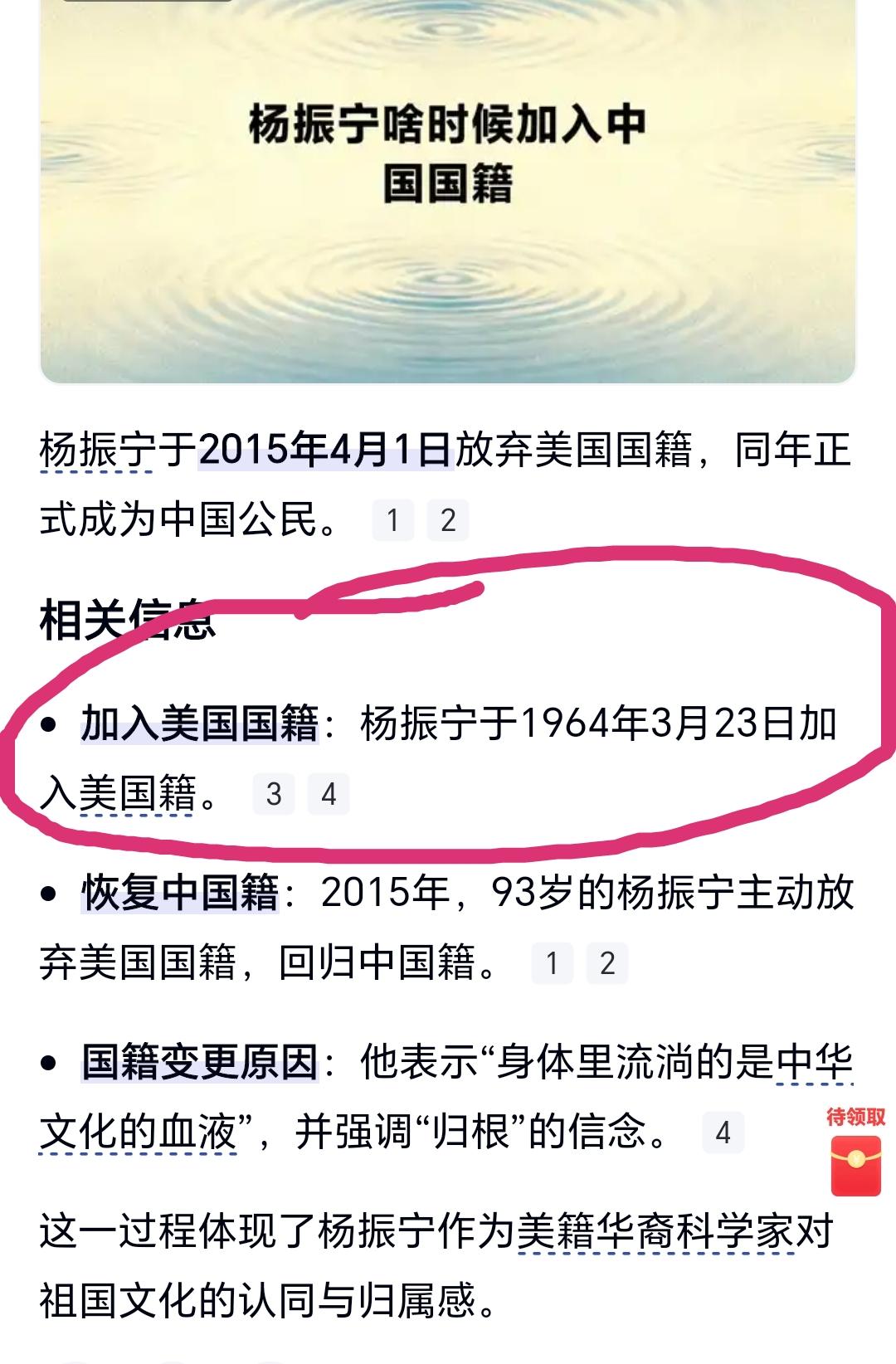 杨振宁先生去世了,但是关于他的一些谣言还没有死去。他对人类探索宇宙奥秘的伟大贡献不必赘述,甚至在昨天,他都还是这个世界活着的最伟大的物理学家。他的学术成就无可争议,但是在中国,总有些人对他的国籍问题说三道四,甚至被有些人来带节奏。 有些人总是说中国人对世界没有贡献,没有人获得诺贝尔奖。事实上杨振宁和李政道在1957年获得诺贝尔物理学奖时都是中国国籍,杨振宁最重要理论规范场论提出的时间是1954年。 杨振宁加入美国国籍是1964年。 李政道加入美国国籍是1963年。 中国人没有得到过诺贝尔奖的谣言可以休止了。 虽然他们获奖后加入美国国籍,但他们对中国的感情从未消减。两人都对中国的科技发展作出了巨大的贡献。 所以不要简单地以国籍来看问题,有些人有中国国籍,但是干的却不是人事。有些人不一定有中国国籍,却深深地爱着这片土地。 致敬杨振宁先生。 点右上角关注我,我们一起去看这个魔幻的时候