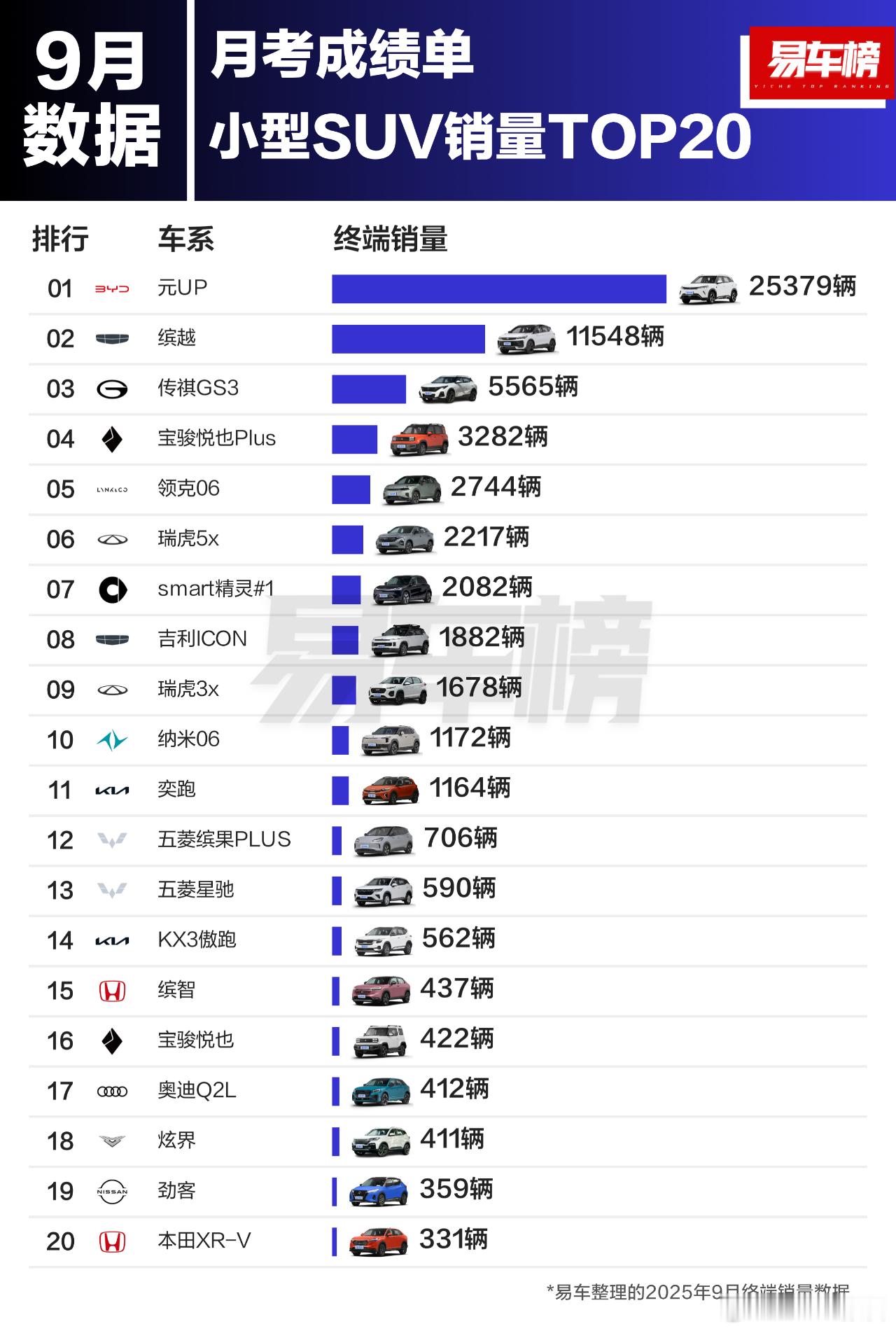 小型SUV销量第一名为元UP,销量为:25379辆。