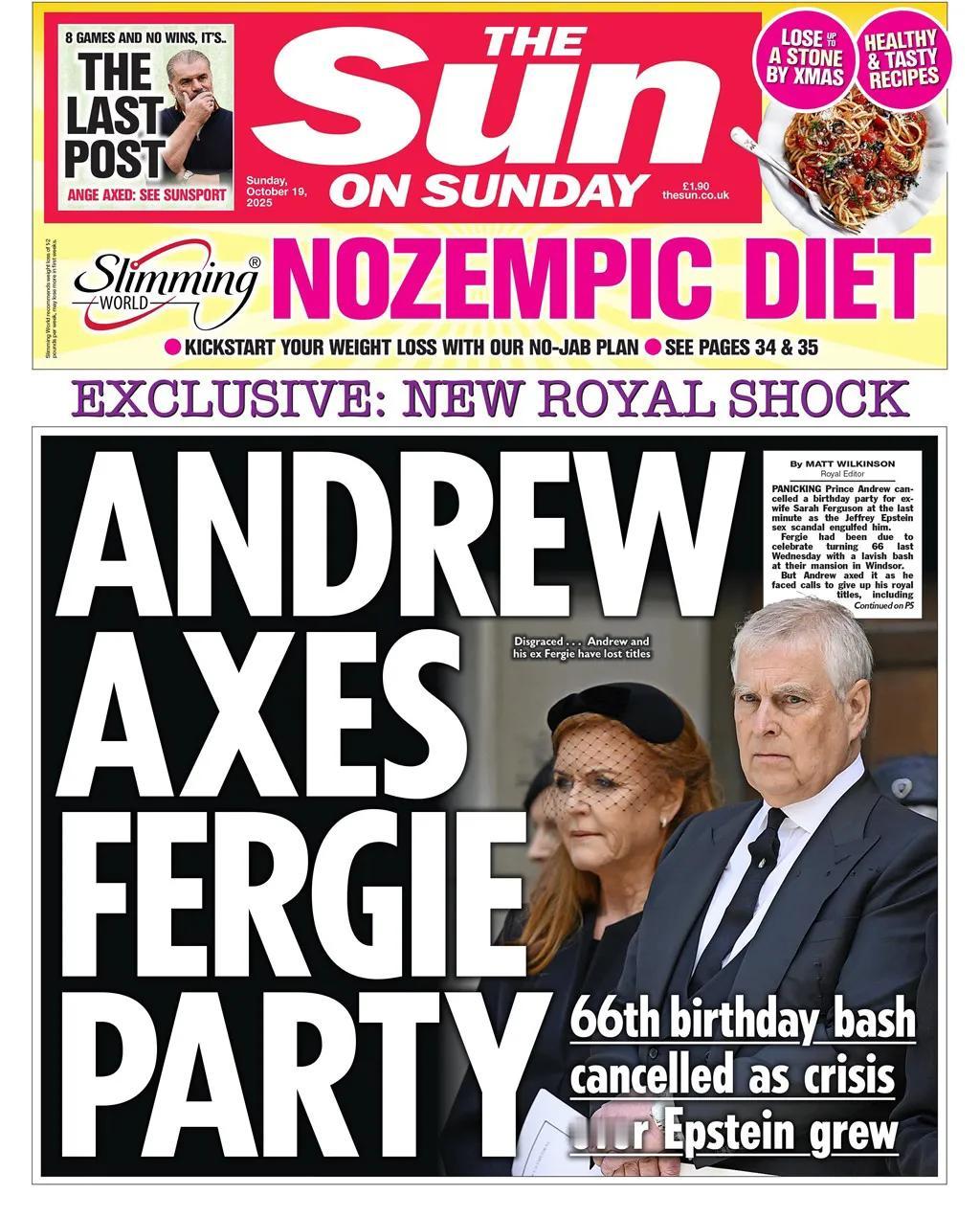 英国《太阳报》周日报道称,丑闻缠身的英国安德鲁王子因杰弗里·爱泼斯坦丑闻取消了为前妻莎拉·弗格森举办的派对。报道称,这位前约克公爵夫人原本计划在温莎举办一场“奢华的派对”,庆祝她的66岁生日。