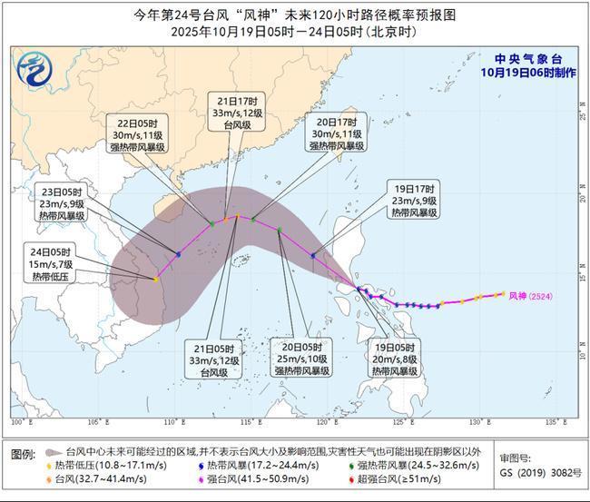 长沙晚报掌上长沙10月19日讯中央气象台10月19日6时发布台风蓝色预警:今年第24号台风“风神”(热带风暴级)昨天傍晚在菲律宾吕宋岛东南沿海登陆(18米/秒,998百帕),今天(19日)早晨5点钟其中心位于菲律宾吕宋岛上,就是北纬14.0度、东经122.0度,中心附近最大风力有8级(20米/秒),中心最低气压为995百帕,七级风圈半径150-180公里。