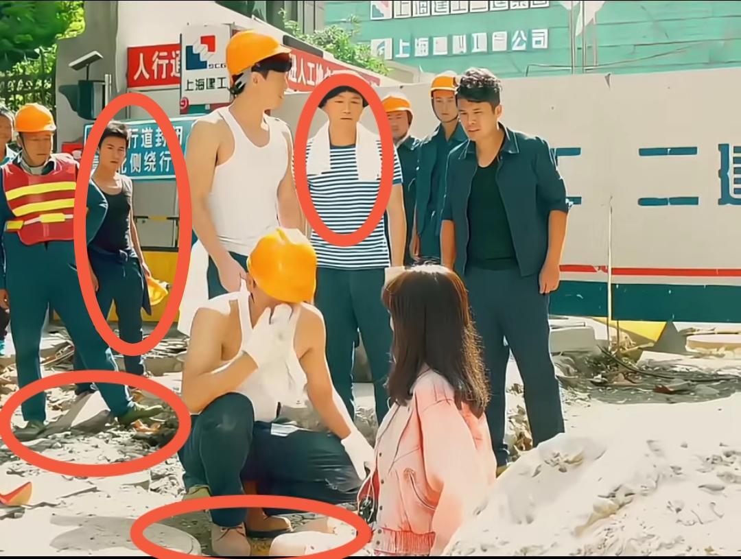 粗制滥造!!工地上穿白色马褂,竟然没有一点脏的痕迹,脖子上搭的白毛巾也是一尘不染,手上的白手套更是洁白无瑕。前面站的这些个都是演员,导演不顾实际情况,完全没有一点工地工人的样子,这就是小鲜肉演的偶像剧,脱离现实,脱离人民群众。只有后面穿反光背心的胖子才是这个工地上真正的工人,一套工地标配,还穿了一双解放鞋。不过他的神态动作来看,就叉着腰,很不可思议地在看他们表演,感觉他也很困惑,电视剧还能这样演?