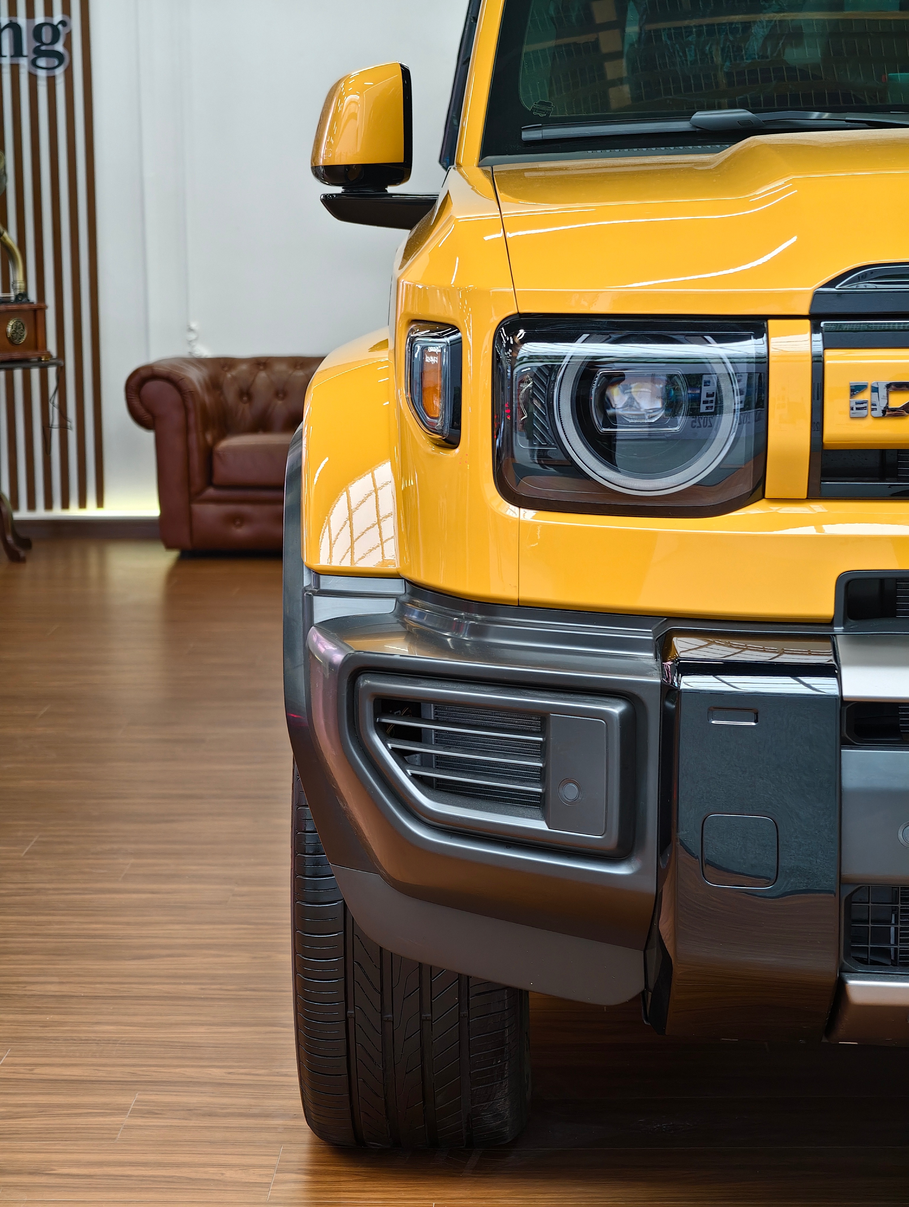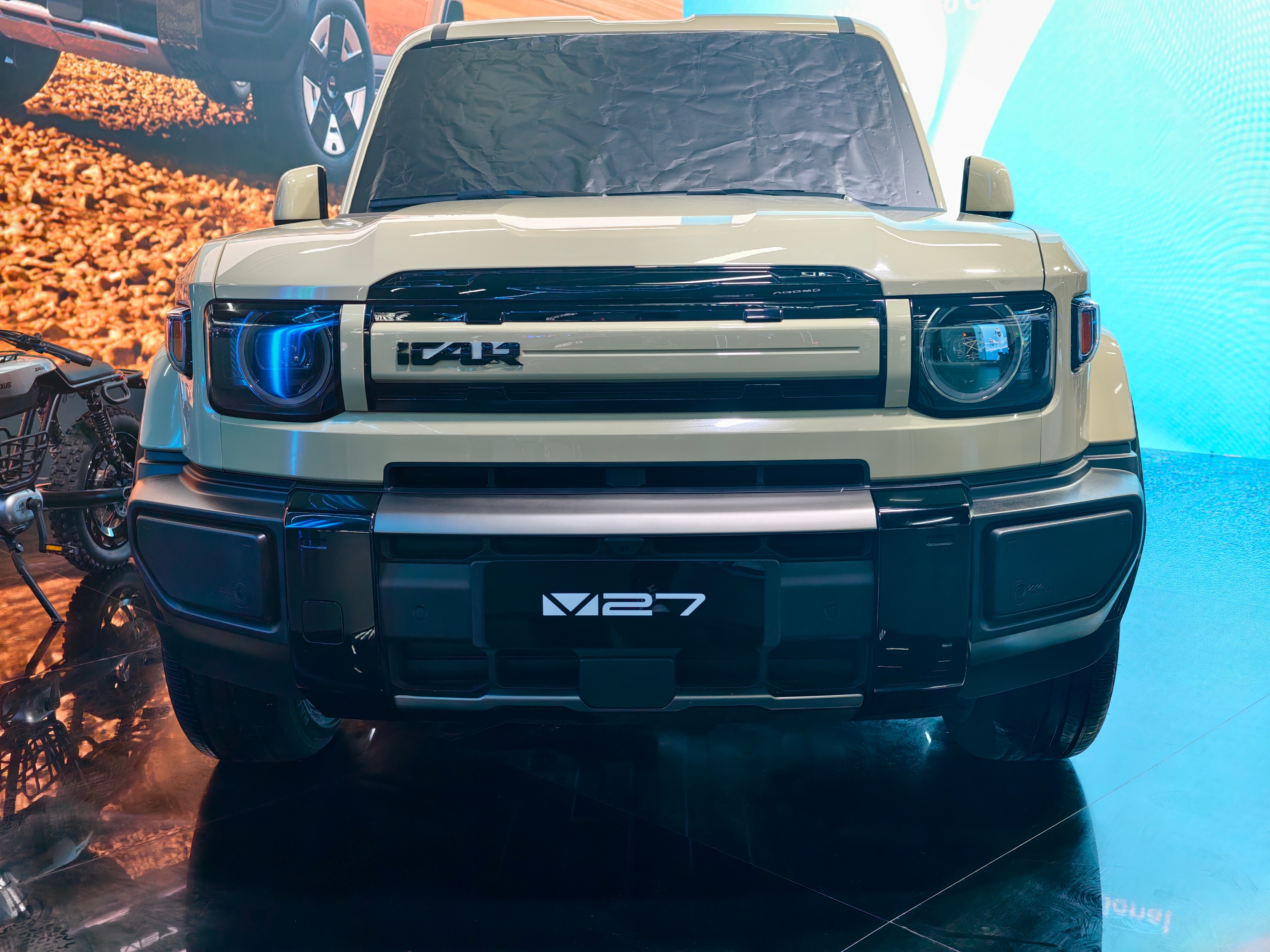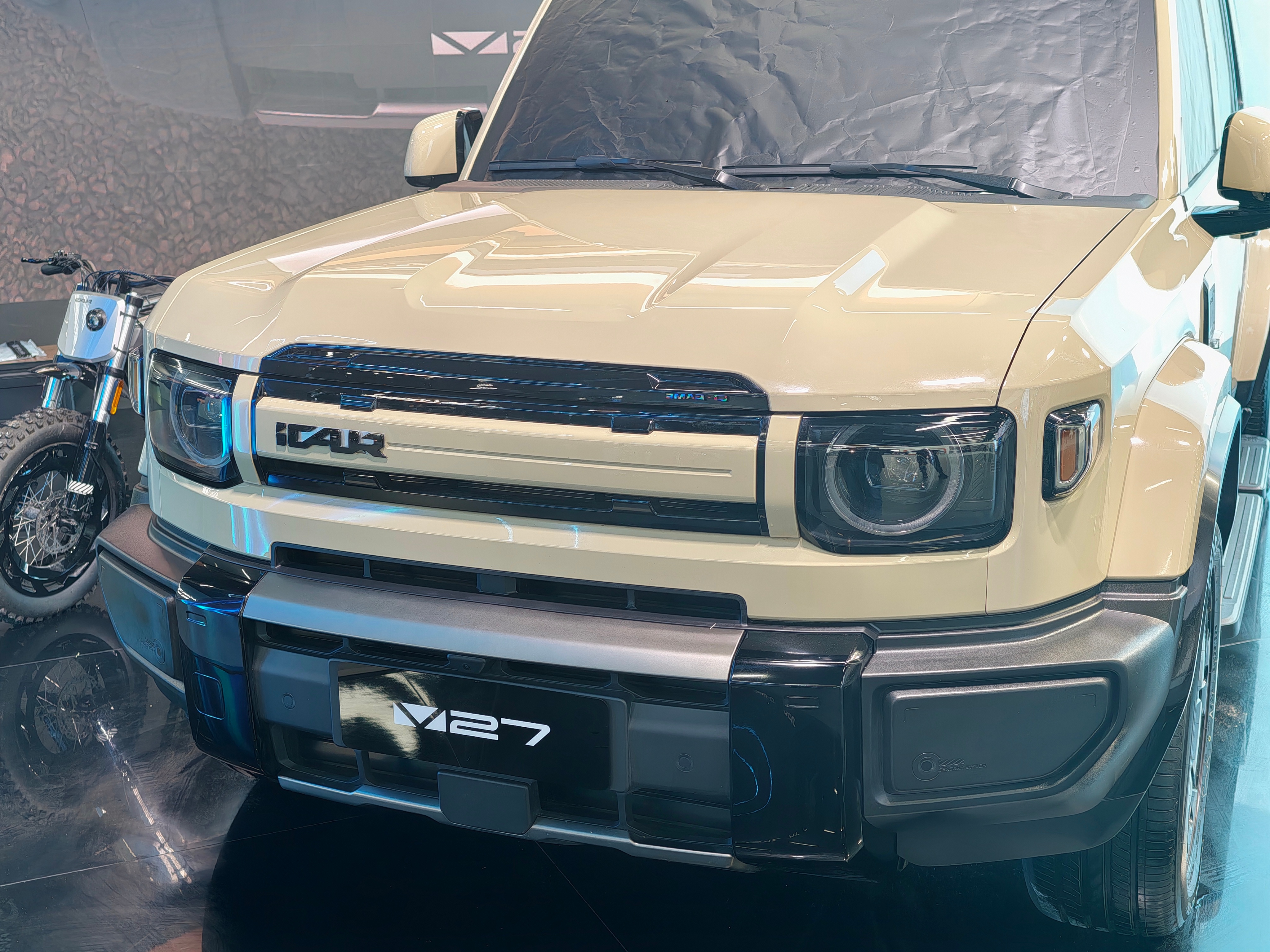 iCAR V27延续了家族式的方盒子造型,谁看了会想不到路虎卫士,但是细节还是有的。前脸是方形灯腔配圆形LED灯环,复古味挺足。