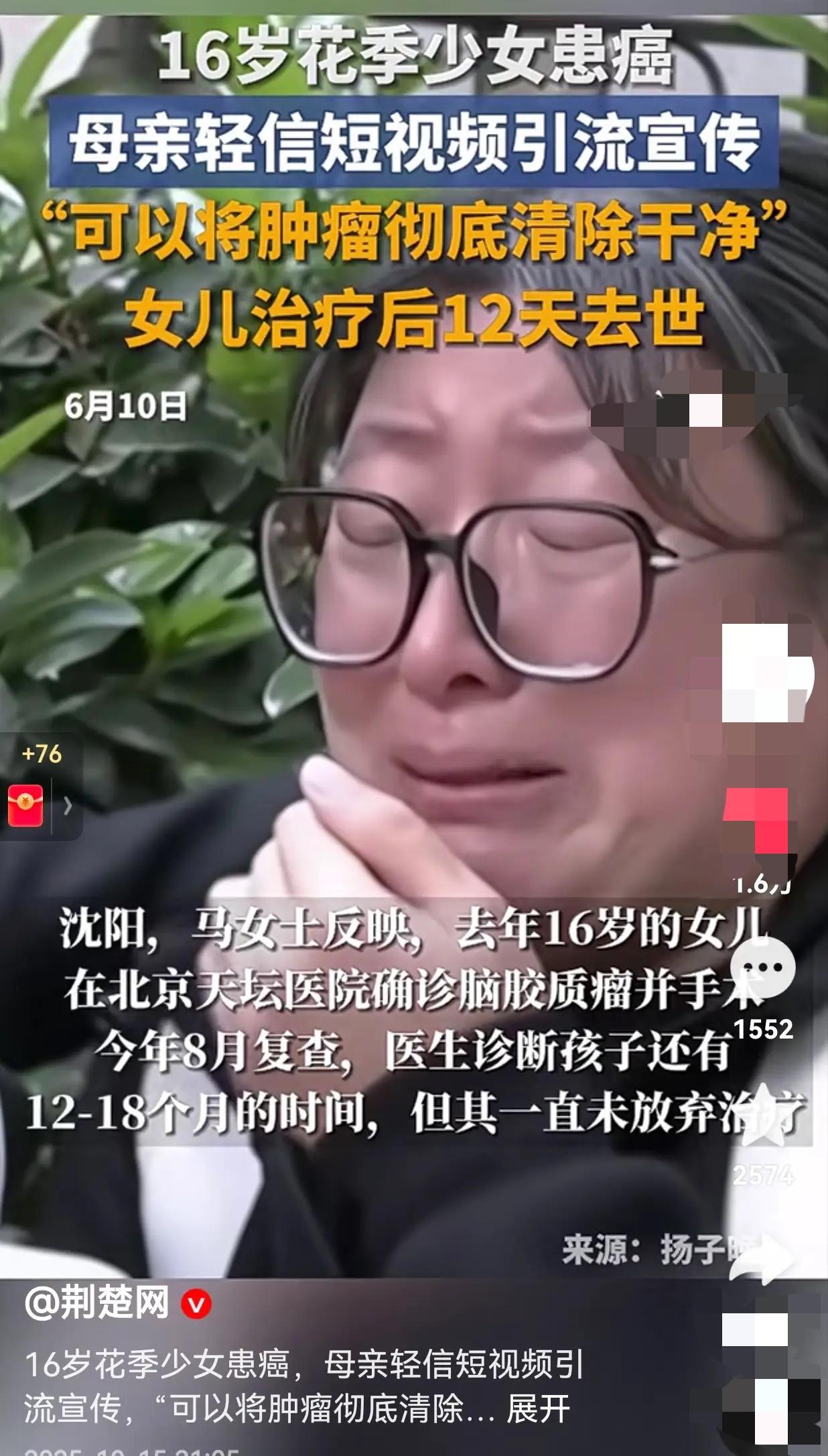 这事儿看得我心揪得疼! 沈阳马女士17岁女儿脑胶质瘤扩散,本就只剩一年多时间,却被网上“胶质瘤克星”骗了——说两声动刀就能切干净肿瘤,她急着救女儿,竟真交了6万。 结果治疗才4小时,12天后孩子就没了!警方一查,所谓“高端仪器”就是普通超声治疗机,机构连肿瘤治疗资质都没有!退了6万钱,可孩子的命再也回不来了。 这些骗子太丧良心,专挑绝望的家属下手;平台也该管管,咋能给这种机构引流?更要提醒大家,正规大医院都没辙的病,网上“神医”怎么可能有办法?别让救人心切,成了骗子敛财的缺口。