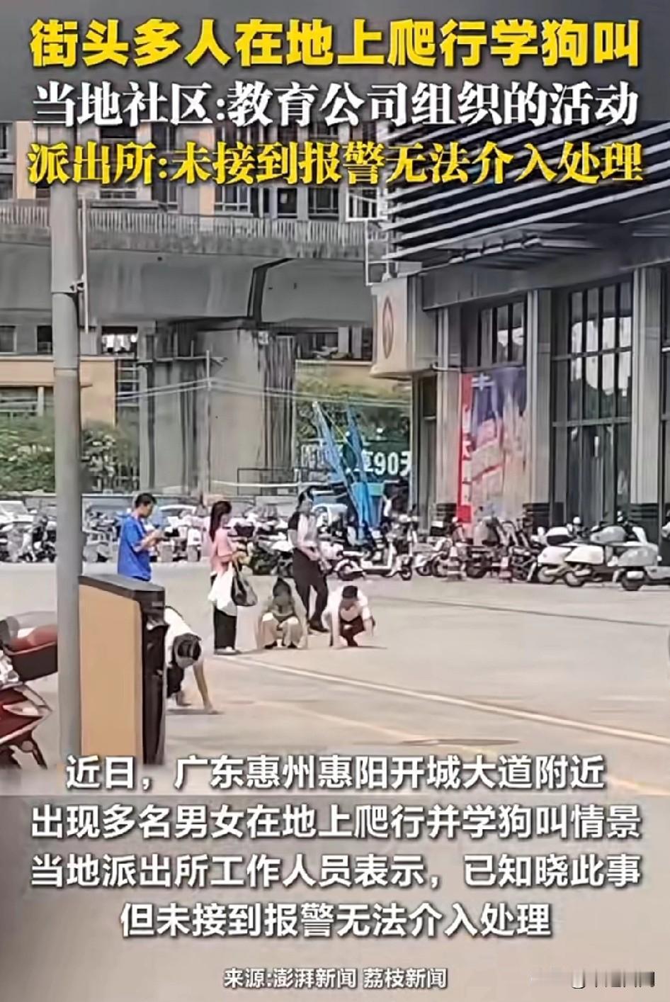旺旺旺旺旺旺…? 近日广东惠州惊人一幕!狗叫声低沉! 街头多人在地上爬行学狗叫,有男有女,当地社区:教育公司组织的活动, 公司说为了突破自我![捂脸] 不要脸,不要尊严的突破?学会当狗的突破?这是要员工永远发不了财?狗永远只能吃剩的,能发财的有几个? 派出所:未接到报警无法介入处理