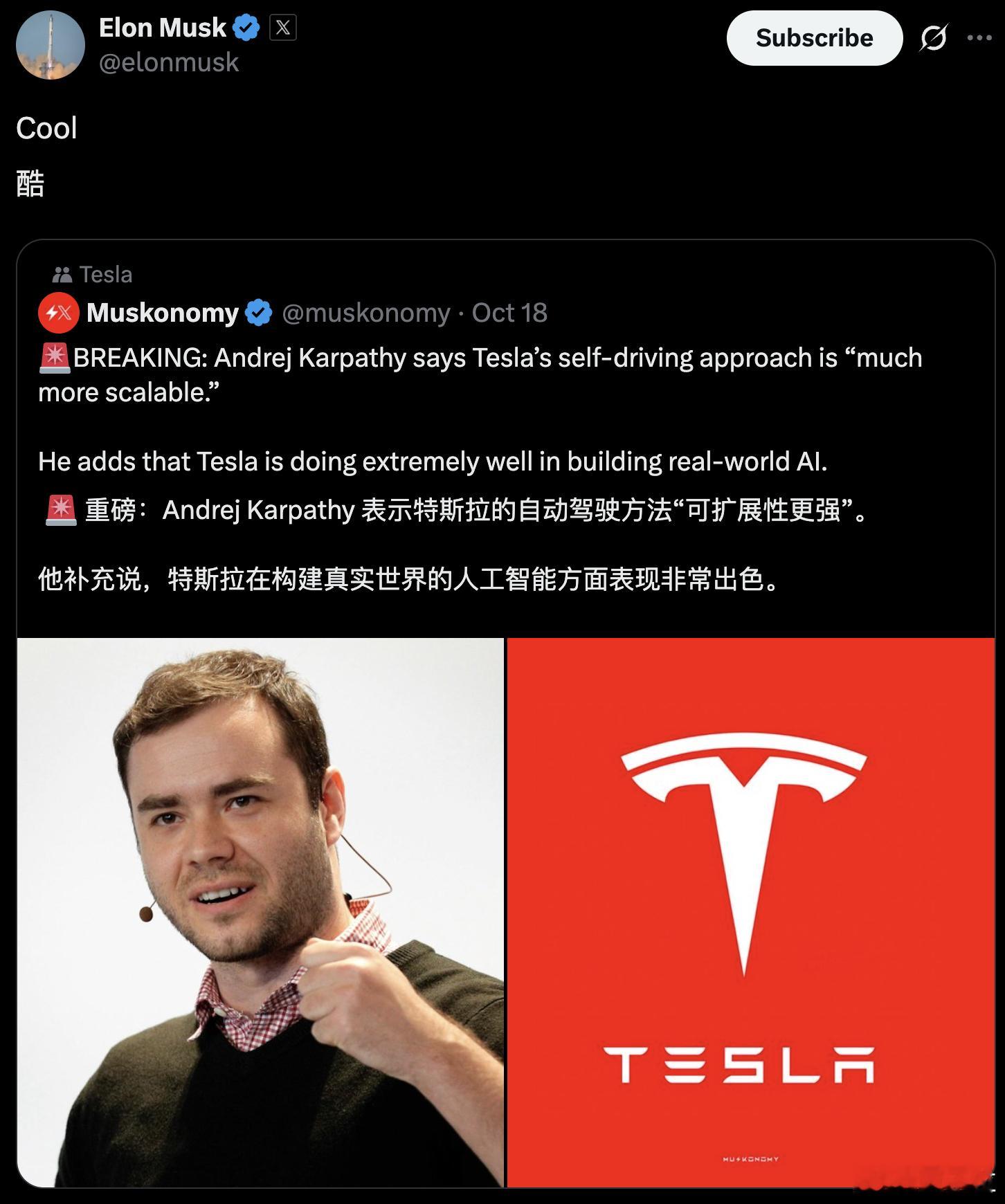 紧接着,不到一小时,马斯克又转发了卡帕西称赞特斯拉自动驾驶的帖子。【图2】