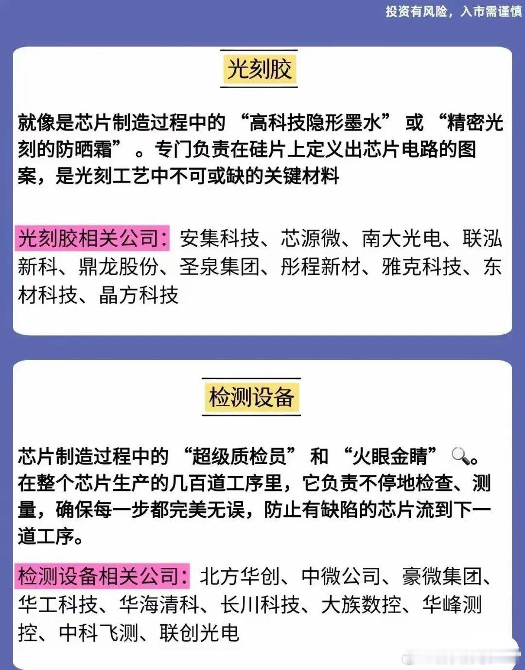 这些个股从光刻胶的“材料-配套-封装”到检测设备的“设备-测试-配套”,全面覆盖两大环节的全产业链节点,构建了半导体制造“图案定义-质量管控”的核心生态。企业各以技术或产能优势切入细分领域,共同推动国产半导体在光刻与检测环节的突破,但行业仍面临技术壁垒高、研发周期长、市场竞争激烈等风险,投资需结合企业核心竞争力与行业国产替代节奏谨慎评估。