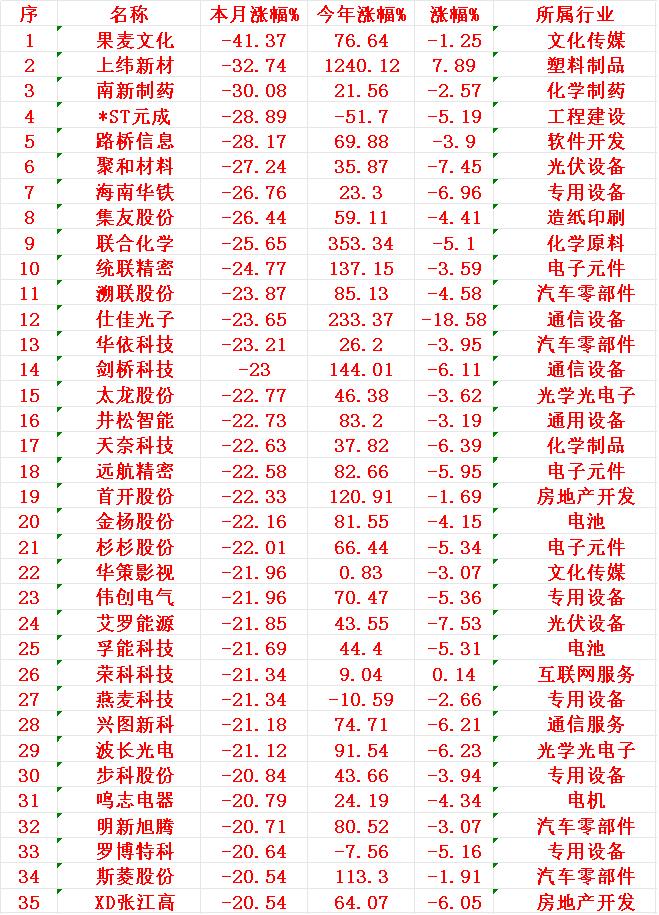 十月以来,整个市场“跌幅最大”的35名单汇总 果麦文化:本月跌幅41.37%,今年以来涨幅76.64% 上纬新材:本月跌幅32.74%,今年以来涨幅1240.12% 南新制药:本月跌幅30.08%,今年以来涨幅21.56% *ST元成:本月跌幅28.89%,今年以来跌幅51.70% 路桥信息:本月跌幅28.17%,今年以来涨幅69.88% 聚和材料:本月跌幅27.24%,今年以来涨幅35.87%