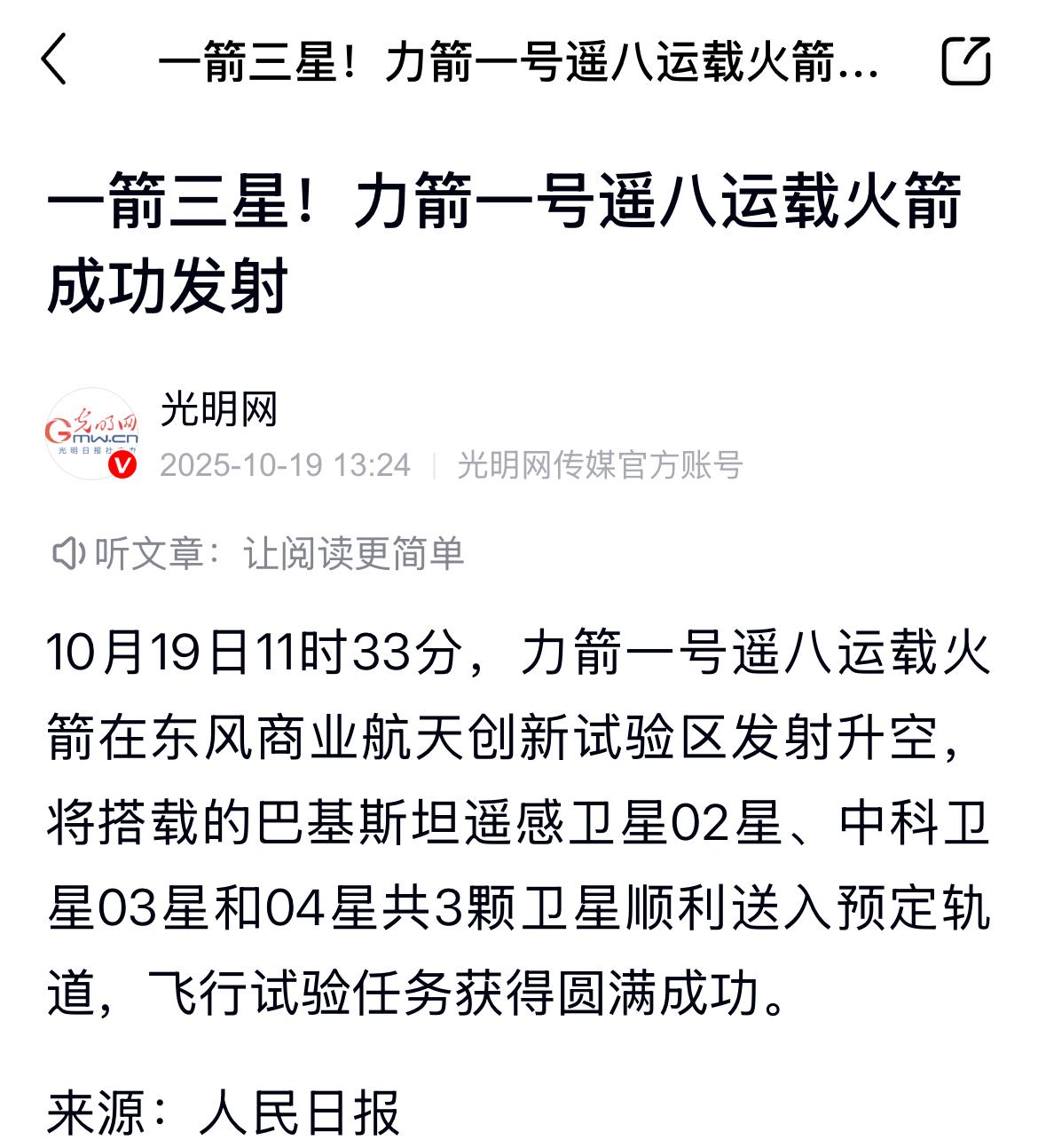祝贺! 刚刚!我国成功发射! 10月19日11时33分,东风商业航天试验区又“放了个大烟花”——一箭三星!巴基斯坦遥感卫星02星+中科卫星03、04星齐刷刷上天,这波操作直接把商业航天实力拉满! 不得不说,现在发射卫星跟“拼快递”似的,效率高到离谱。 更关键的是,中巴合作再升级,卫星技术共享背后,是国际合作的硬核示范。 你觉得未来商业航天还能玩出什么新花样?评论区聊聊你的脑洞~中国航天的卫星 中国卫星 爆料 新闻