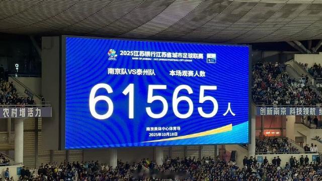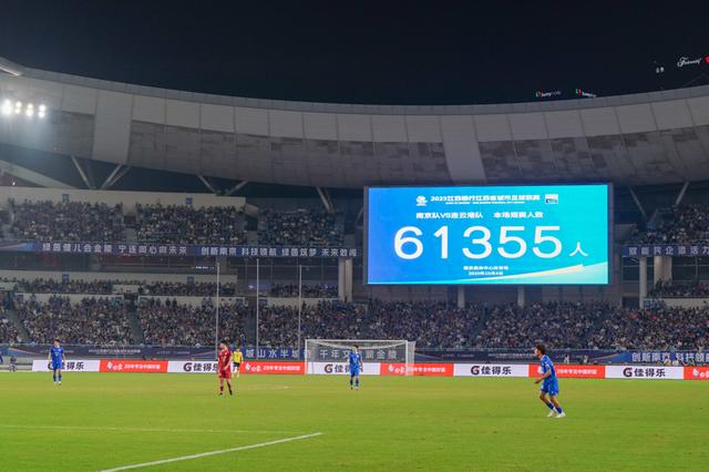10月4日,大屏幕显示本场比赛共有61355名球迷到场观赛。“苏超”四分之一决赛中,南京队主场与连云港队在常规时间1比1战平,通过点球大战,南京队以5比3的总比分战胜连云港队,晋级半决赛。新华社发