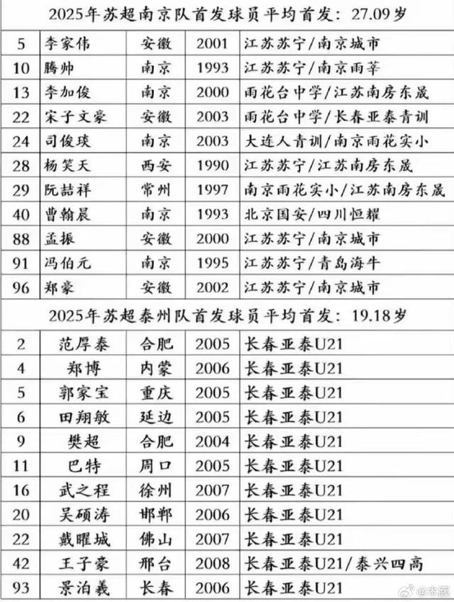 也有网友比较了“苏超”南京队、泰州队的球员构成。