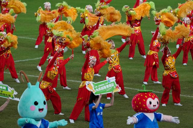 10月18日,演员在中场休息时表演。当日,在江苏南京举行的2025江苏省城市足球联赛(“苏超”)半决赛中,南京队主场与泰州队在常规时间1比1战平,通过点球大战,泰州队晋级决赛。新华社记者李博摄