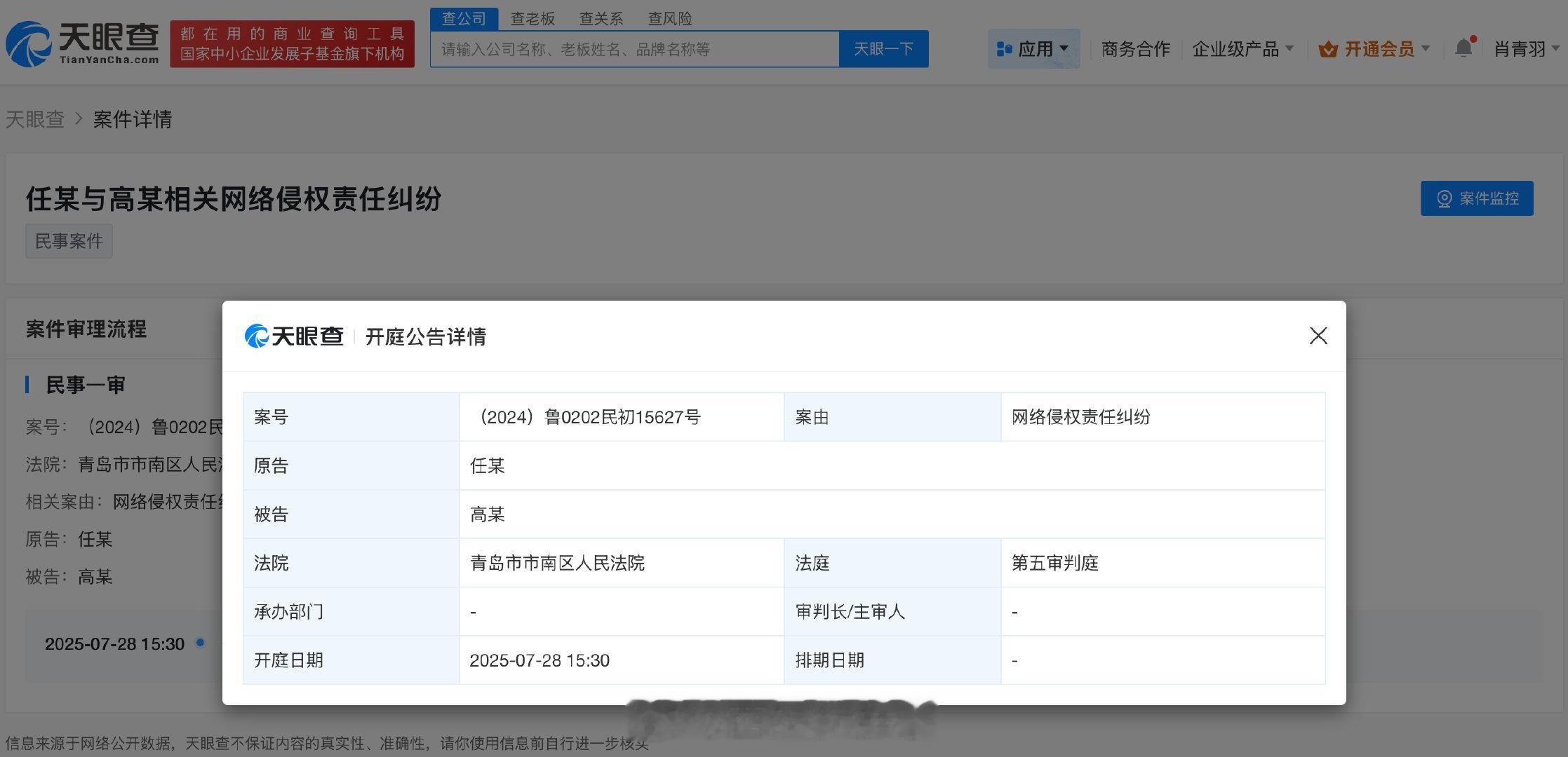 天眼查法律诉讼信息显示,近日,任国超(任嘉伦)与高某某相关网络侵权责任纠纷案件新增开庭公告,原告为任国超,该案已于7月28日在青岛市市南区人民法院开庭审理。任嘉伦受伤