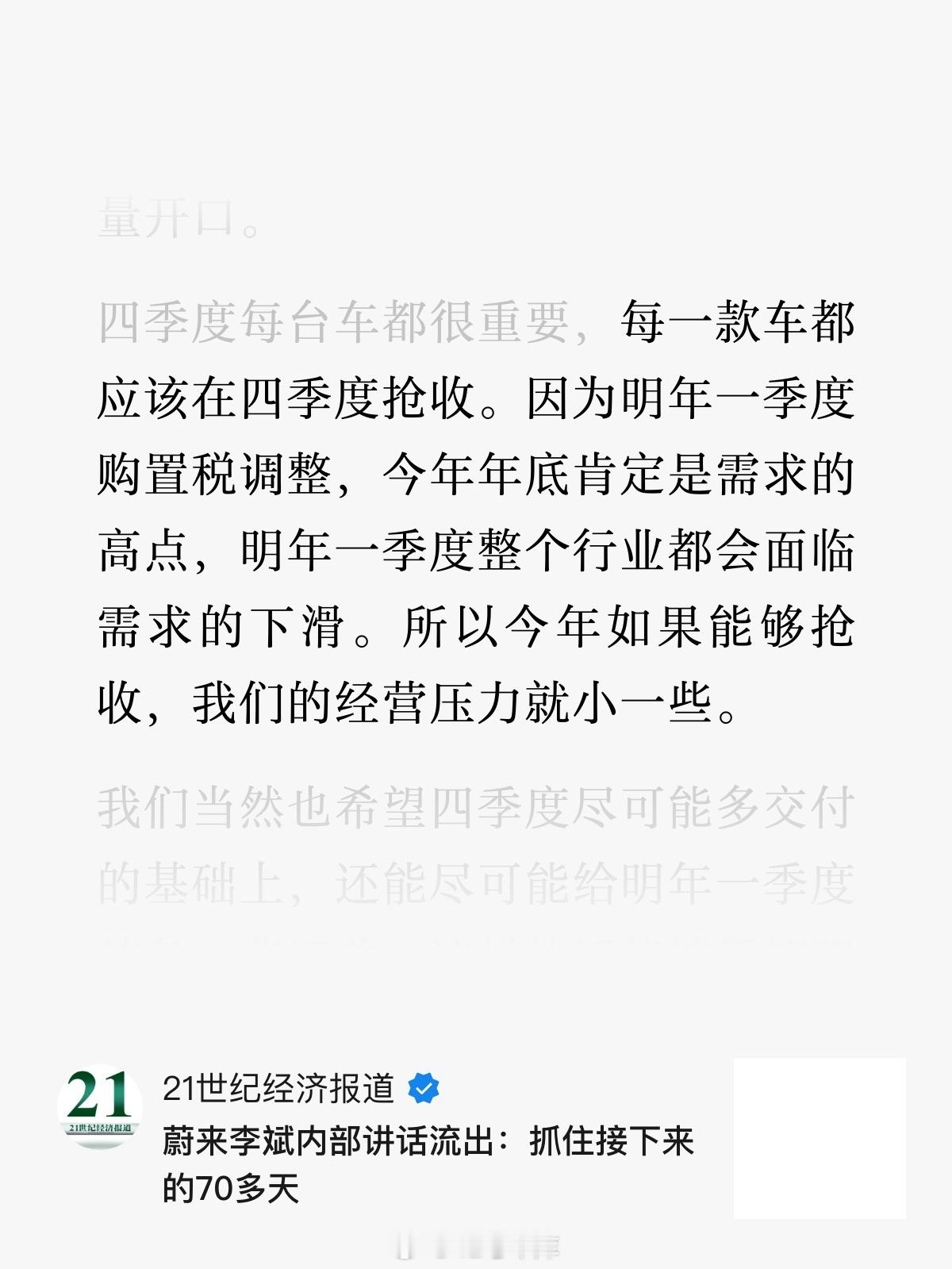 李斌最新的内部演讲,再次谈到了四季度盈利目标: