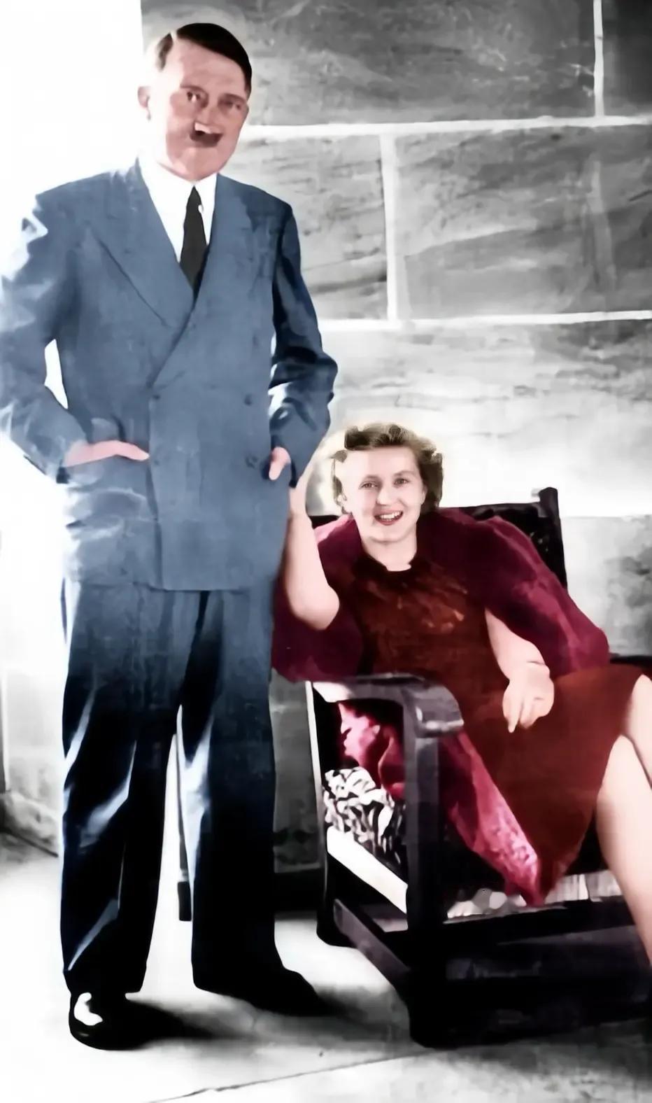 这是希特勒和他的情妇,也是后来与他举行婚礼的妻子爱娃。希特勒比爱娃大了23岁,然而,爱娃并未嫌弃这年龄差距,始终追随在他左右。在希特勒谋划整个战场战略的过程中,爱娃也跟着担惊受怕。从外表上,明显看不出他们有如此大的年龄差距,或许是因追随希特勒操心费力,她的容颜衰老得很快。最后,爱娃追随希特勒服毒自杀。二人终究还是举行了一场简短的婚礼,婚礼之后便服毒自尽,成了古今人们茶余饭后的笑谈。