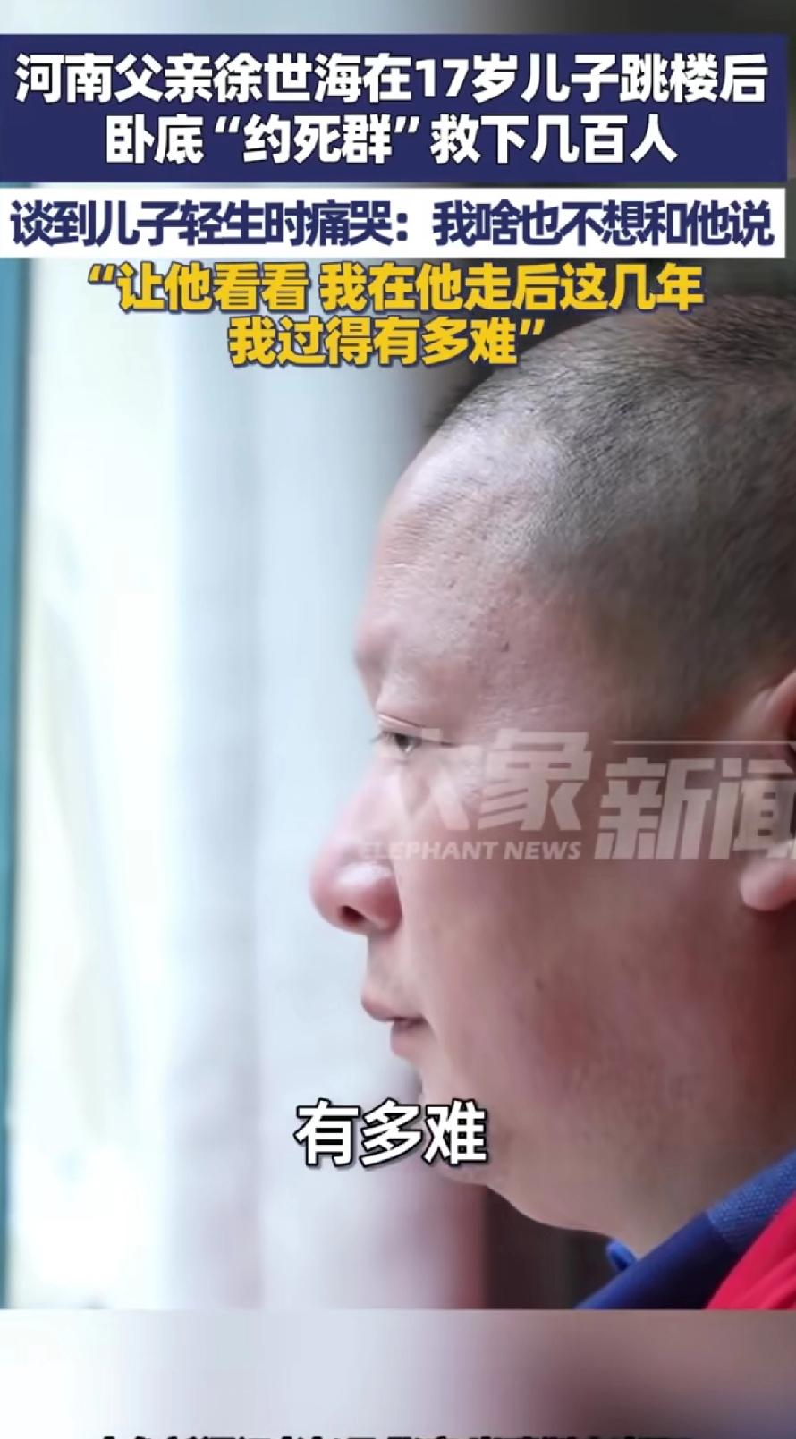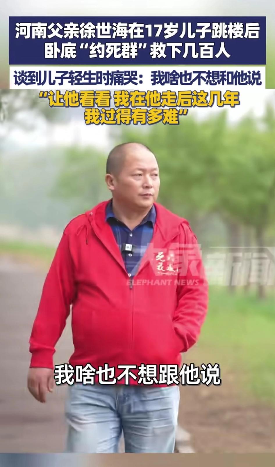 河南父亲徐世海在17岁孩子跳楼后,“卧底”约死群救下几百人! 谈到儿子轻生时痛哭:我啥也不想和他说! 如果可以的话!“让他看看在他走后这几年我过得有多难” 真是不理解还有“约死群”这样的群? 更不理解群主是谁?为什么要建这样的群? 河南父亲徐世海的故事太让人动容。2020年5月,17岁儿子突然轻生,他在翻看儿子日记和网络记录后,决心潜入“约死群”当网络劝生者。 徐世海本是从事家装工作的普通人,还是郑州市红十字水上义务救援队队员。他早年就加入古风、学习、游戏等群了解孩子。 儿子离世后,他更是全身心投入劝生。他记不清劝过多少孩子,当孩子喊他“海叔”“海爸爸”,他就特别满足。