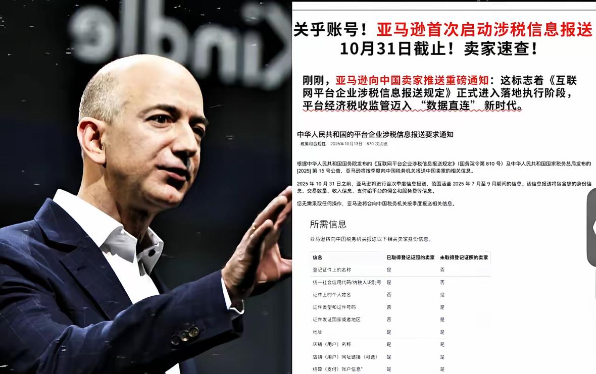 亚马逊突然不讲道德了,开始掀桌子了! 直接揭了所有中国卖家的底裤。 2025年10月13日,亚马逊已发布通知,将依据中国税务新规,首次向税务机关报送中国卖家信息,覆盖2025年7-9月数据,后续按季度报送。 这事乍一听是合规操作,可细琢磨全是不对劲的地方。要知道过去几年,中国卖家可是亚马逊全球市场的“提款机”,贡献了近30%的第三方卖家交易额,现在说翻脸就翻脸,哪有半分合作伙伴的样子? 有人说亚马逊是在配合新规,可早不报晚不报,偏偏选在很多卖家刚做完三季度旺季备货的时候报数据。这时候把交易流水、利润情况全交上去,等于把卖家的经营底牌摊在阳光下,后续税务核查、补税压力谁来扛? 再看看亚马逊自己的操作,一边要求中国卖家合规报税,一边在平台上继续推行“流量倾斜”政策——那些愿意多交平台佣金、参与促销活动的卖家,依然能拿到更多曝光。合着合规只是针对中国卖家的枷锁,平台自己的利益半点不受影响? 更让人心寒的是,不少中小卖家之前根本没收到任何预警。有个做家居用品的卖家跟我吐槽,三季度刚投了200多万备货,现在突然要面对税务核查,资金链都快绷断了。亚马逊要是真为卖家着想,至少该提前几个月通知,给大家留足准备时间吧? 还有人拿“国际惯例”说事儿,可你去看看其他跨境平台,无论是eBay还是速卖通,在配合税务政策时都会主动帮卖家对接税务咨询服务,甚至提供合规培训。亚马逊倒好,只发个冷冰冰的通知,连句“后续如何应对”的指导都没有,这算哪门子的“国际惯例”? 说到底,亚马逊这波操作根本不是什么合规配合,而是精准拿捏了中国卖家的软肋。现在中国跨境电商卖家在全球市场的竞争力越来越强,亚马逊怕是怕了,想通过这种方式给大家“上枷锁”,遏制咱们的发展势头。 各位读者你们怎么看?欢迎在评论区讨论。