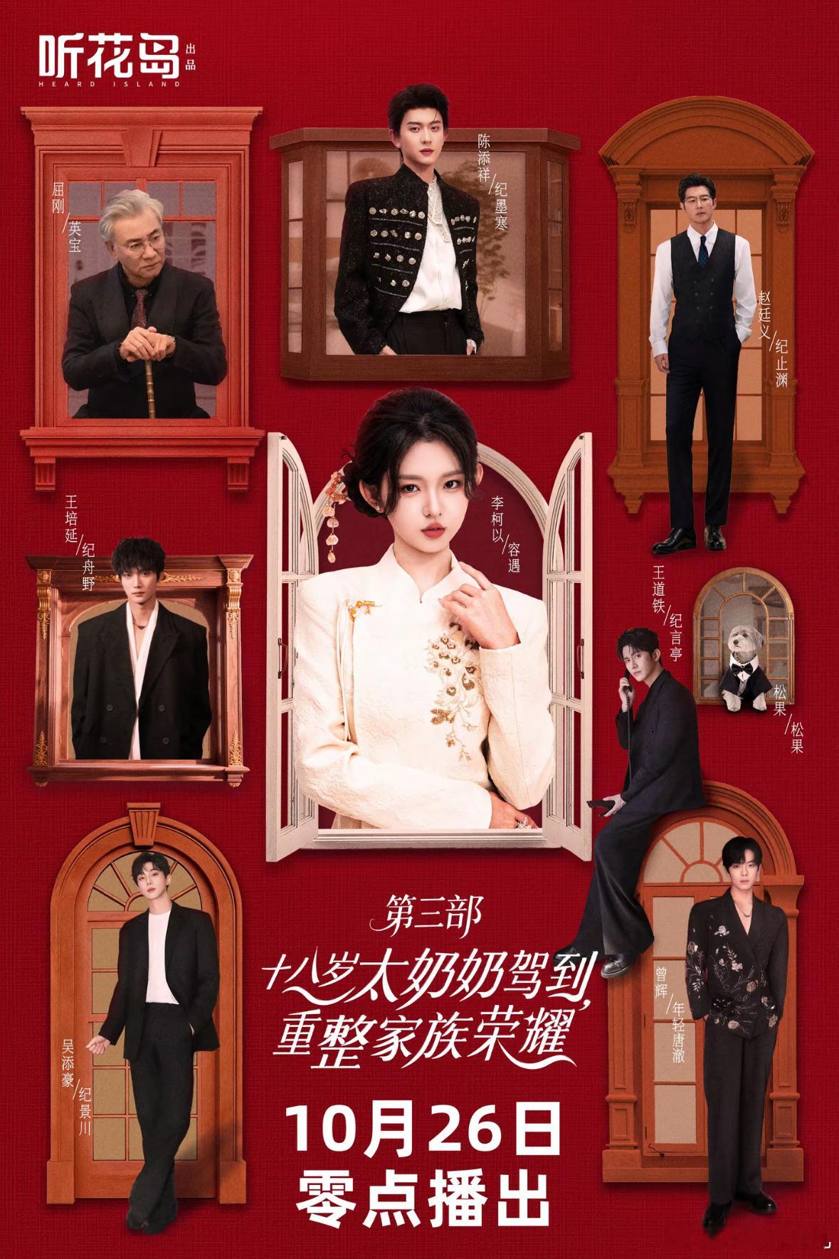 《十八岁太奶奶驾到重整家族荣耀3》定档10.26了,这个系列短剧拍到第三部人也是越来越多,集齐了李柯以、曾辉、屈刚、王道铁、赵廷义、陈添祥、吴添豪、王培延和孟娜👍🏻