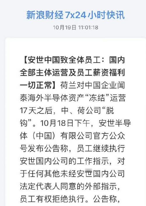 荷兰的安世可能没想到,安世中国反戈一击,他们根本要不起。原本,荷兰方面以为自己可以轻松拿下这家半导体巨头的控制权,却没料到,这一动作反倒触发了中国企业的高效反应。 10月18日下午,安世中国公开声明,与荷兰总部切割,自成体系运转,并且工资照发,看似简单的一纸文件,背后是一次精准的商业反击。 安世中国虽在管理层面受荷兰总部指挥,但它的顶层母公司其实是中国的闻泰科技,而闻泰科技又是荷兰安世的全资控股方,这意味着,无论是在荷兰,还是在中国,安世的最终所有权都在闻泰科技手里。 如今,荷兰政府的介入实际上是在试图拿走一家中国企业的海外资产,在这种情况下,闻泰科技将安世中国独立出来运营,显然是为了保护关键资产,这是合乎规则的自救手段。 从结果看,这一招的影响极大,安世的制造能力主要放在中国,这里有完整的生产线、有经验丰富的技术团队,还有多年耕耘下形成的稳定供应链。 这些东西离开中国,荷兰安世几乎什么都得从零开始,重建工厂不仅需要巨额资金,还要耗费几年时间,在全球竞争激烈的半导体行业,这种停滞几乎等于是自断生路。 更关键的是,安世的主要市场同样在中国,失去这里,他们的销售和利润会立刻缩水,换句话说,荷兰方面不仅没能顺利夺走资产,反倒面临产能和市场的双重空缺。 企业层面的应对已经让局势发生逆转,但如果事态继续升级,国家层面的反击手段也有的是,中国在全球稀土供应链的优势毋庸置疑,而稀土是半导体和精密制造的关键原料。如果荷兰不收手,中国完全可以禁止向他们供应相关稀土,让他们的生产陷入困境。 同时,对荷兰安世的产品在中国市场实施明确限制,让他们在全球供应链中被孤立,这样的动作,会让其他国家和企业看到抢夺中国资产的实际代价。 这种博弈还可能延伸到荷兰其他核心企业,比如阿斯麦(ASML),它的光刻机制造依赖全球供应链中的稀土材料和精密部件,中国在其中占据重要位置。 荷兰已经限制了高端光刻机的出口,中国完全可以以对等原则,在出口稀土等战略物资时设置障碍,让阿斯麦的生产受到影响。 当然,任何反击都必须配合明确的舆论引导,过去在一些资源管控措施上,过于含蓄的表述给了西方媒体抹黑的机会,他们把合理的安全举措说成是针对全世界的“武器化”。 因此,未来的对外声明必须直接点明对象和原因,让全球明白这是对不公平打压的回应,而不是随意的封锁。 这一次,闻泰科技和安世中国的做法,无疑展现出中国在博弈中的韧性与智慧。