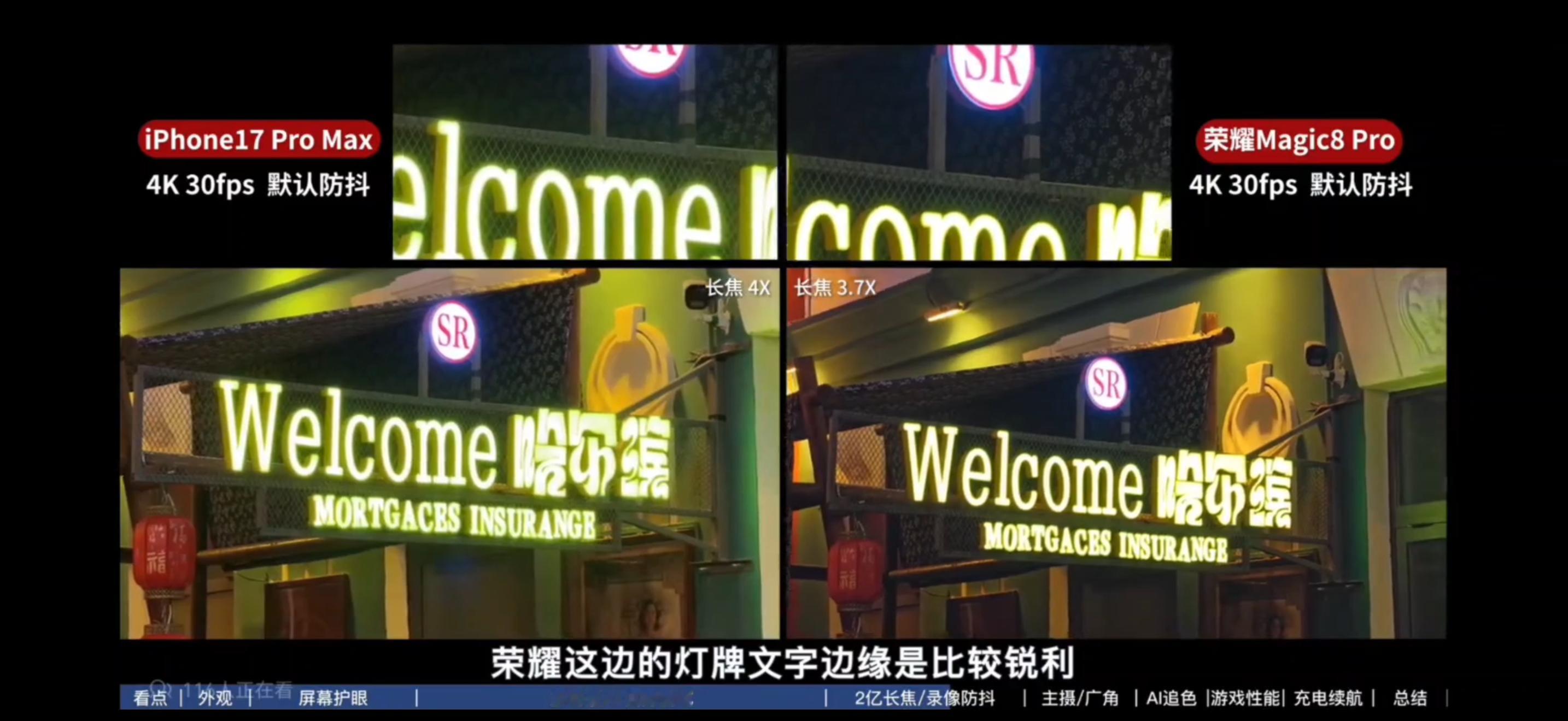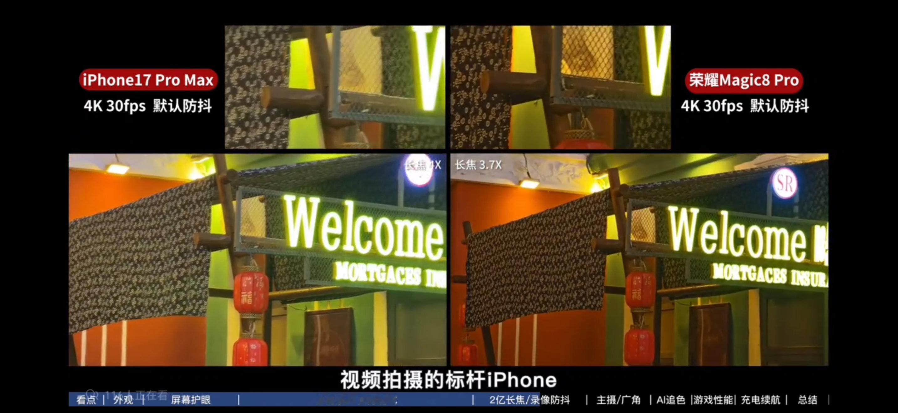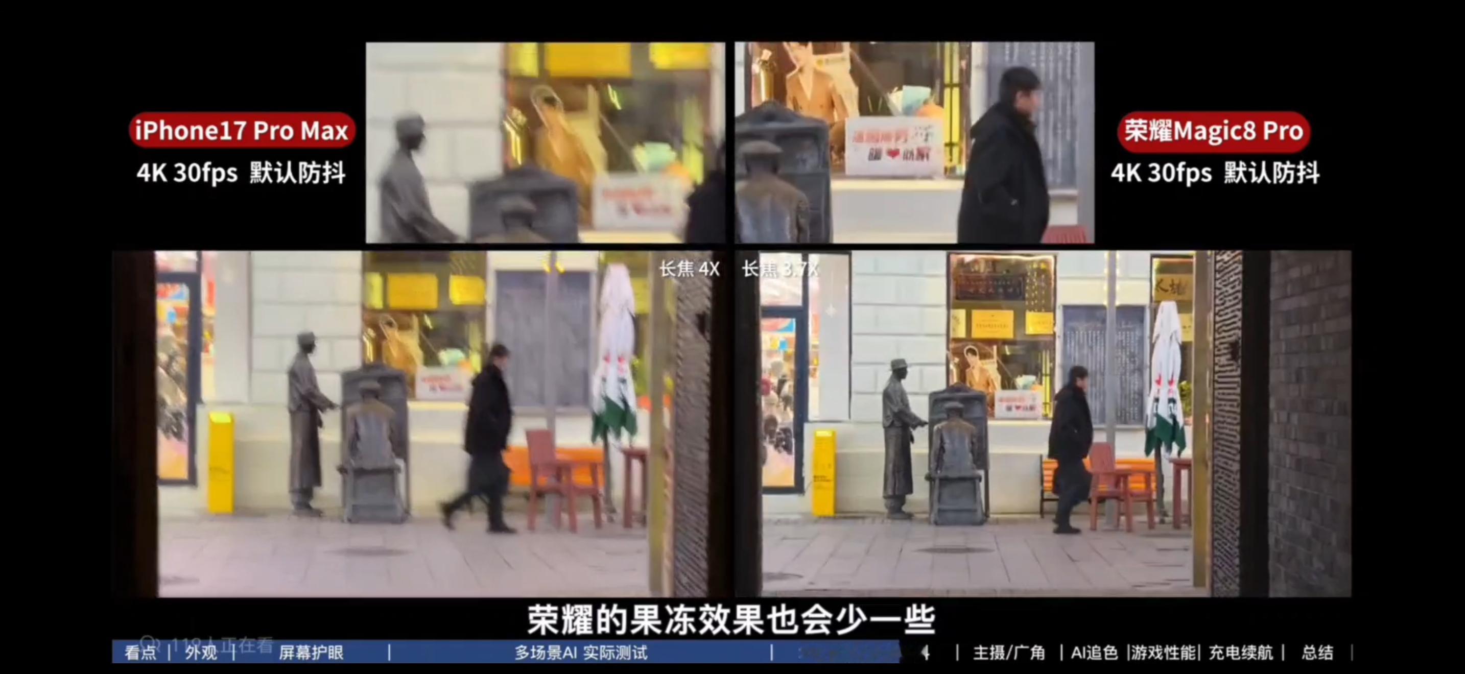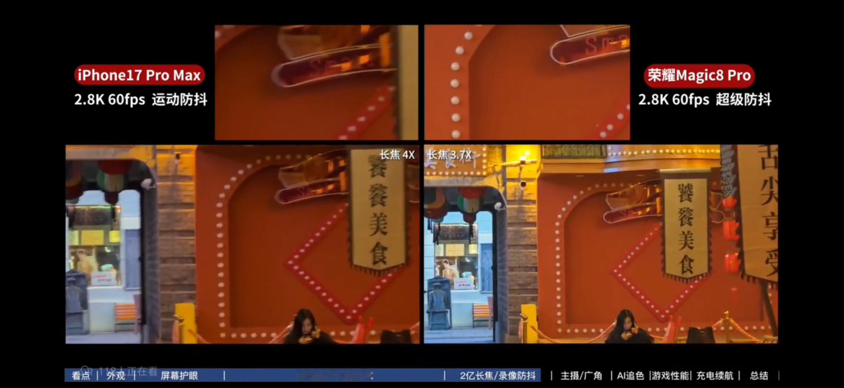 荣耀Magic8Pro用上了今年最强的CIPA 5.5防抖,看了一些博主拿荣耀和iPhone17ProMax的对比视频,可以看到荣耀的高光压制、防抖稳定性都比iPhone更强,今年是荣耀影像年,Magic8Pro这个表现咋样?