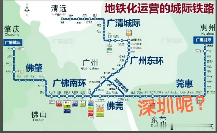 广东城际为何独独落下了深圳? 大家都清楚,上个月广东开通了三条段城际线路,将 6 个城市完美串联起来。这 6 个城市分别是清远、广州、肇庆、佛山、东莞和惠州,这六座城市之间可乘坐城轨相互抵达! 可为何没有深圳呢?深圳仅有孤零零的一条穗深城际,它从深圳机场出发,途经虎门、东莞港、东莞西,最终抵达新塘南站。这条城轨与广东城际明明存在交接点,即东莞西,为何不将它们连接成一片呢? 倘若广东城际能够扩大覆盖范围,把深圳机场到广州新塘南的这条城轨连接起来,想必能发挥出更大的作用。 有了深圳2000多万人口基础的客流,广东城际估计会更有利持续发展! 广东城际路线图 广东城际轨道 珠三角城际交通 广东城际 珠三角城际列车 广州城际 广东城际铁路