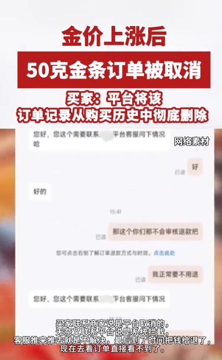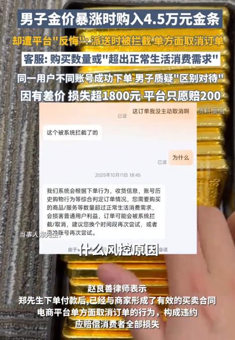 10月10日,深圳,男子在某平台花了45015元买了50克金条,谁料,刚下完单,金价突然上涨,男子乐坏了,赶紧转手高价卖出,没想到,次日订单显示“派送中”时又改成“已取消”,男子赶紧联系商家,商家表示他们没权限取消,男子又联系平台,客服表示他的订单被系统拦截了。商家和平台相互踢皮球推卸责任,男子气不过,发到网上,结局让他闹心。     郑先生(化名)平时就喜欢盯着金价,总想着趁便宜囤几根金条当理财。     那天晚上,他刷平台,看到一家金店旗舰店在做活动,50克的投资金条标价45015元,算下来每克900.3元,比当天大盘价还便宜十几块。     他一看觉得挺划算,就没多想直接下单付款,还选了次日达的物流。     付完款不到两个小时,郑先生照例去刷行情,发现大盘价蹭蹭往上涨。     心里高兴得不行,他赶紧打开二手平台,很快就联系上一个买家卖出去了。     买家先付了定金,说“你收到金条就把尾款打过来”,让郑先生更放心了。     可第二天下午,他发现订单状态变了。原本显示“派送中”,已经从北京发往深圳的金条,突然变成了“已取消”。     他当时傻眼了,赶紧联系商家客服,对方一句话:“我们没权限取消,找平台问。”     郑先生火急火燎联系平台客服,得到的答复更让人气:“订单被系统拦截了。”     客服解释说,系统会综合判定下单行为、收货信息,如果买的量超过正常生活需求,或者损害普通用户利益,就可能被取消。     郑先生听了火冒三丈:“我就买一根,而且只是改了收货地址,哪点不正常了?”     更让他懊恼的是,再去查订单,购买记录居然被平台彻底删了。     他庆幸自己早截图,不然这单就像没发生过一样。     最头疼的是损失。     因为他已经在二手平台把金条卖掉了,订单被取消后没法交货,只能自己再买。     可这时金价已经涨到941元/克,50克算下来,多花了1800多块。     他找到平台提出三个要求:赔1800多元损失、解释拦截原因、说明删订单的理由。     结果平台拖了好几天,只肯赔200块,其他问题一个字没说。     郑先生试着用另一个实名账号下单,居然成功买到金条。     他当场就懵了:“同一个人,换个账号就合规了?系统判定到底靠啥?”客服只说“会有专员跟进”,之后就没下文。     无奈之下,郑先生把这事发到网上,结果很多网友跟帖说自己也遇过类似情况:“买白银涨价后被砍单”“买耳钉涨价不发货,投诉后订单直接消失”,看来这不是个例。     记者联系平台,客服仍旧态度硬:“只能买家本人咨询,给订单号也答不了。”     律师倒是看得明白,陕西恒达律师事务所赵良善说,郑先生付款后就和商家形成了合同,平台单方面取消就是违约,得赔全部损失,200块根本不够。     可道理讲得再明白,郑先生的问题依旧没解决。     截至现在,平台除了把45015元货款退回来,只肯给200块安抚金,拦截和删记录的原因始终没解释。     郑先生说,这哪是赔偿,分明是打发人。     好好的一笔交易,因为平台一句“系统拦截”变成赔本买卖,订单被删、投诉无门,最后就给200块了事。     网友吐槽:“涨价就砍单,还删记录,这吃相也太难看了。”     对此你怎么看?     信源:逐浪新闻