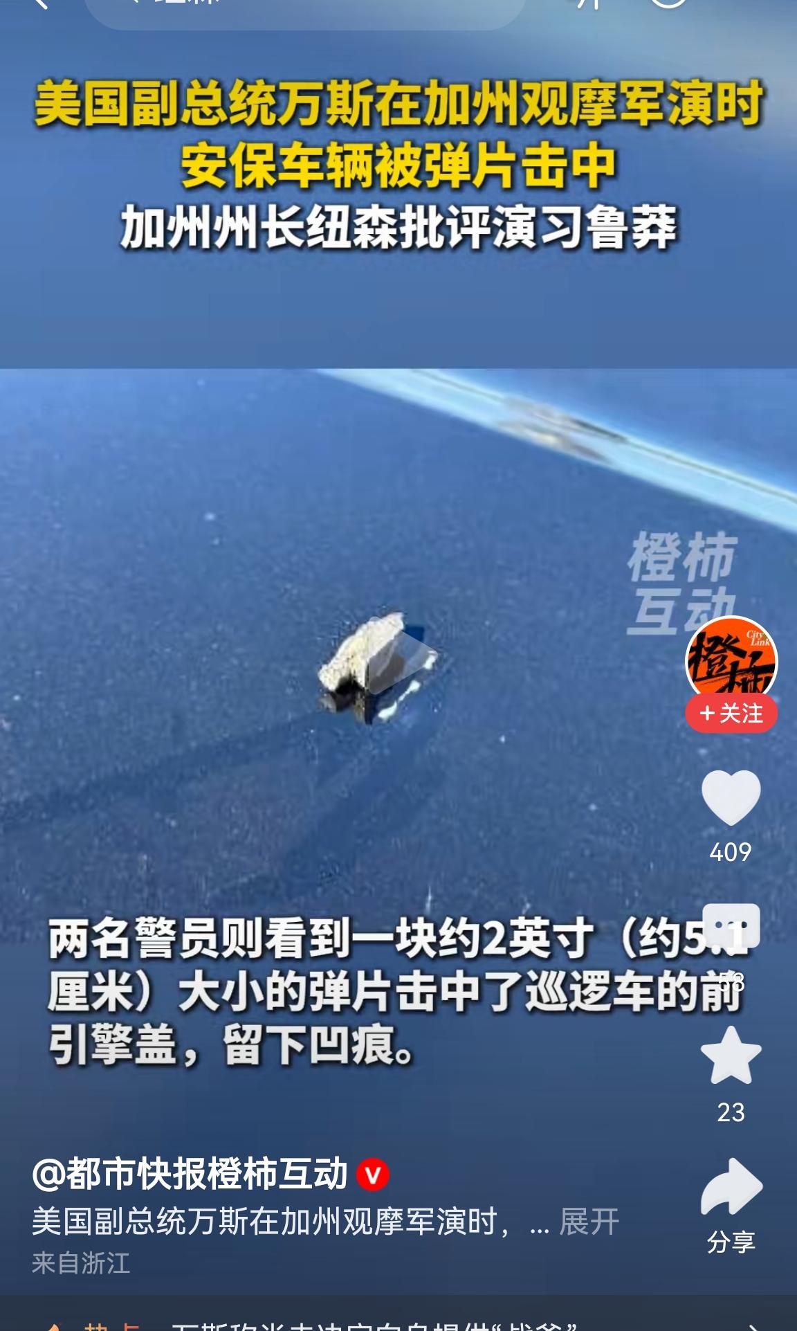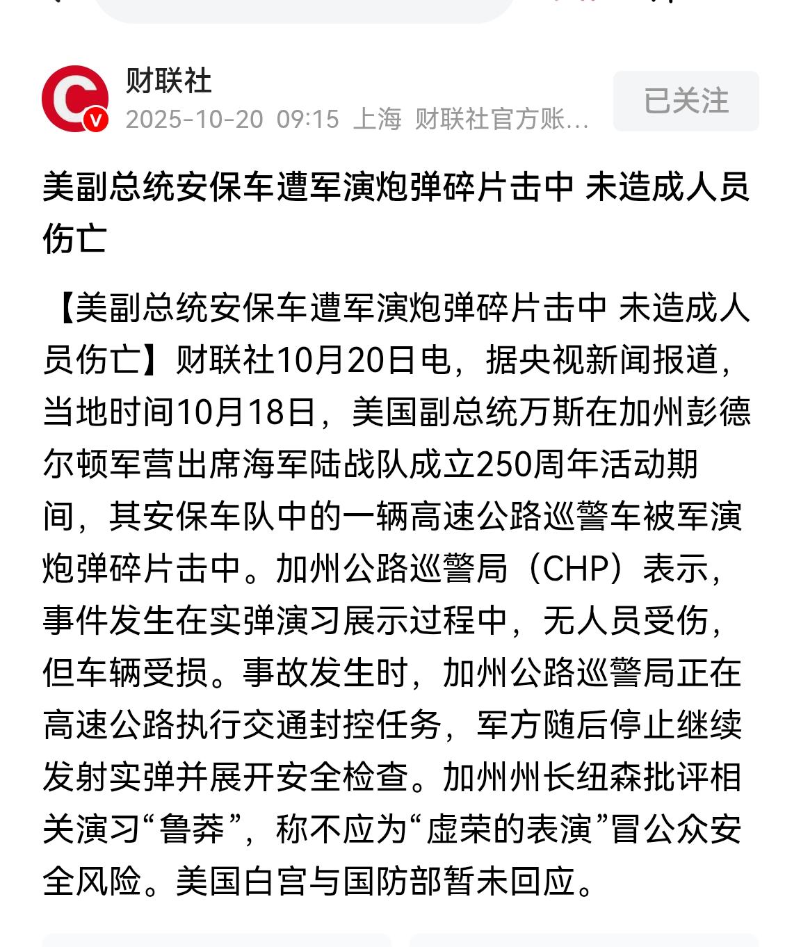 副总统万斯安保车辆被演习炮弹碎片击中, 暂时无人在此事件中伤亡。 根据媒体报道18号,在加州军事基地万斯参加海军陆战队250周年纪念活动。 活动演习中安保车辆被炮弹碎片击中,所幸没有人员受伤。 这算不算海军陆战队在这个250特别的纪念日里送给万斯的惊喜。[狗头]