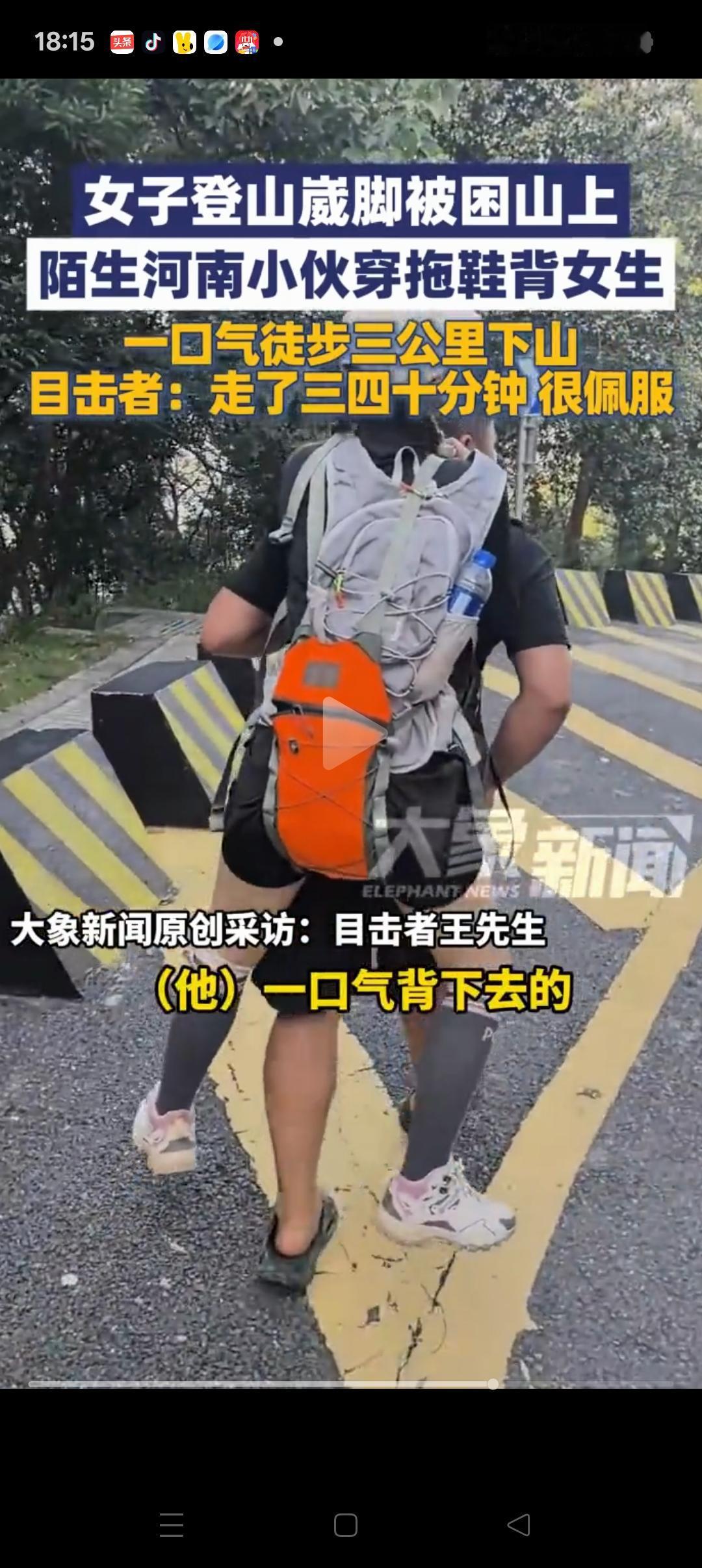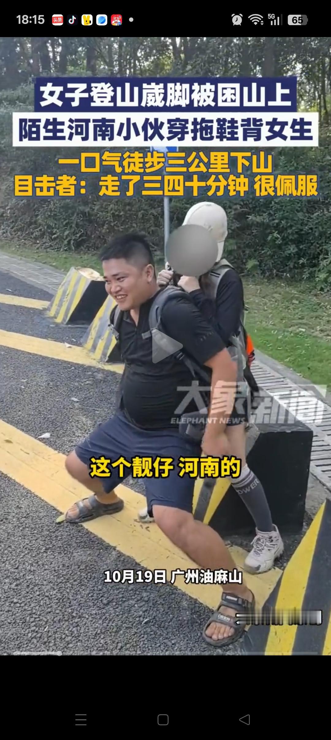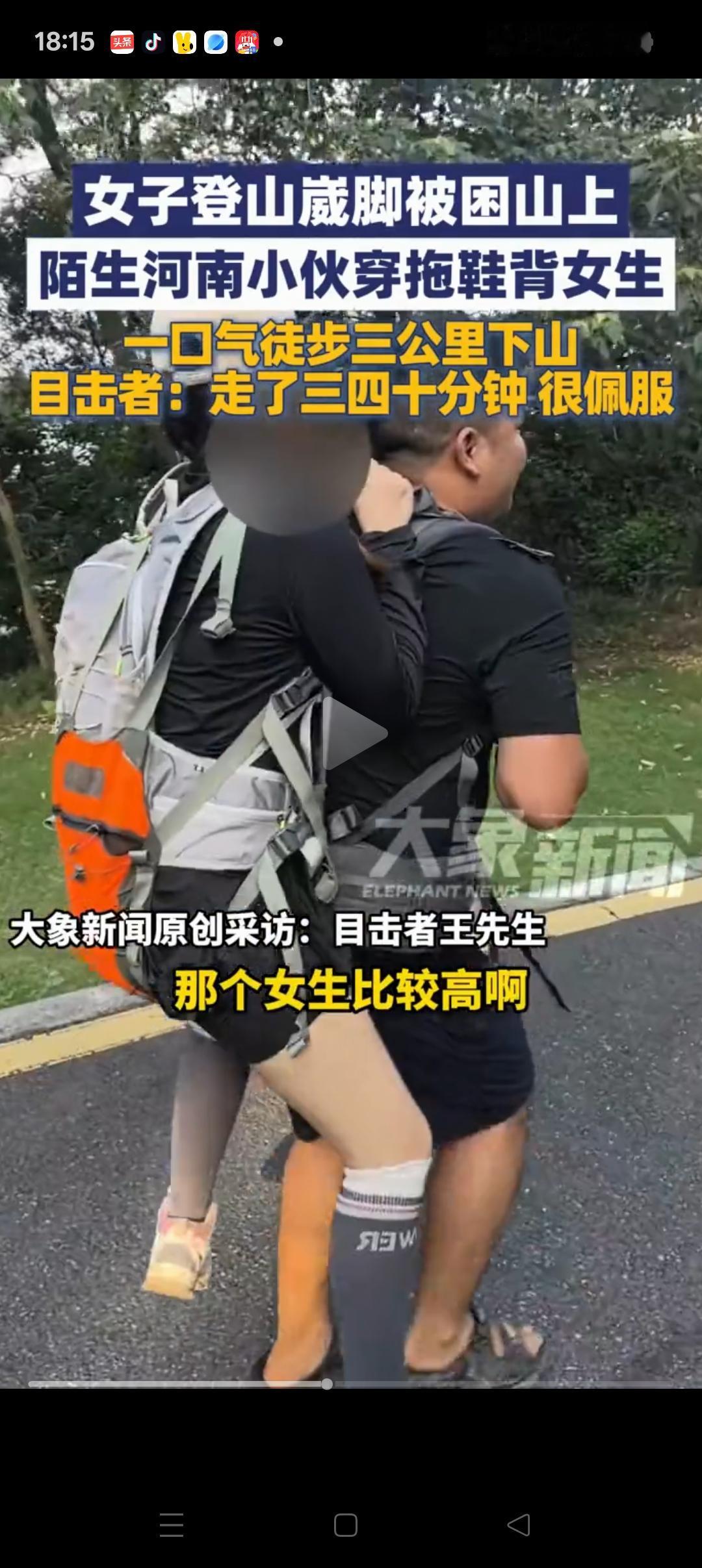 这下好了, 不止河南人,全国都知道你的实力了! 没想到,河南小伙爬山偶遇崴脚的女生,二话不说,一把扛在背上,足足背了40多分钟,都不带休息的。 同行的男生说了,大哥太牛了,女生有170cm,腿又长,一般人真背不起。 看到这里,不经想起以前! 爷爷当时60多岁了,每天早上背着100多斤的东西,走接近10公里的山路到镇上去卖,都不觉得累。 对于以前的人来说,这是挺平常的一件事。但是对于现在的年轻人,确实还挺难的,一般人根本不敢想。 当然,得亏这是个美女,要不然小伙子也没这么大动力[捂脸][捂脸]