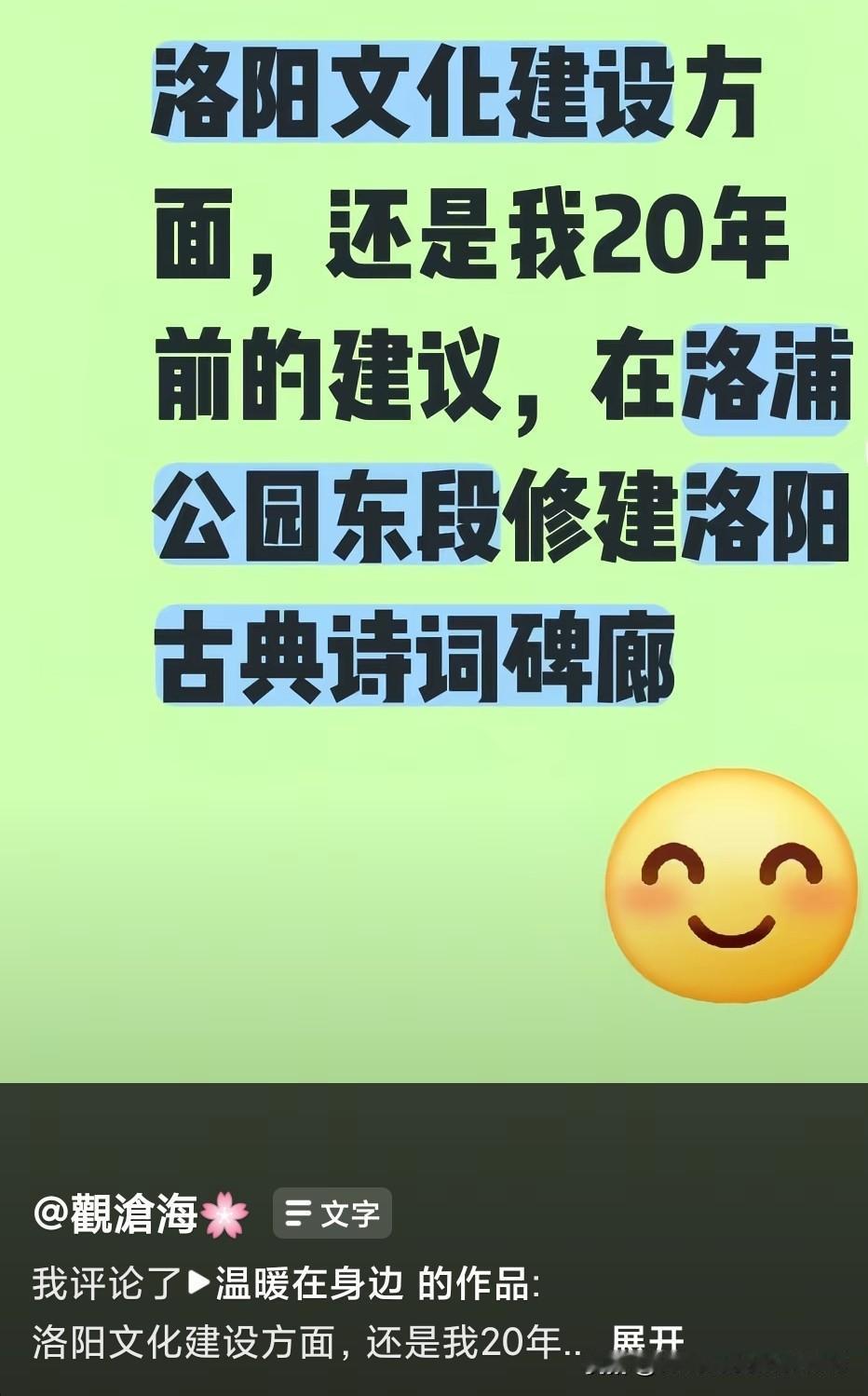 安老师2009年编了5千年看洛阳, 现在常被人们引用, 的确了不起。 不过,比安峰更早的观沧海, 建议洛浦公园东段, 修洛阳古典诗词碑廊更有前瞻性。 如果按此建议, 20年打造到今天, 一定会游人如织, 让洛阳诗词文化蓬荜生辉。 看来功勋章需要来表, 不表谁会知道背后的故事?