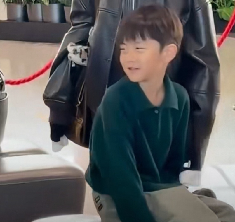 小儿子身穿绿色长袖polo衫,一头短发清爽利落,打造出既时尚又显眼的造型,让他的小眼睛也焕发出迷人的光彩。