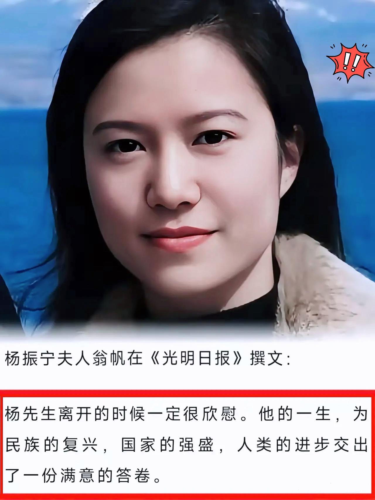 给翁帆女士一个迟到的致敬 翁帆女士在《光明日报》发文: 翁帆那两句平静的话,才是对20年争议最有力的回击!“杨先生走得欣慰”“有他陪伴何其有幸”,没有哭天抢地,却比任何辩解都戳人。 多少人盯着54岁的年龄差,造着“图名利”的谣言,可没人看见她20多年的付出。杨振宁百岁摔倒住院,是她守在床边,见客超一小时就果断终止以护其休息。她陪着先生在清华园过着清净日子,把他照顾得能安享晚年、持续治学。 哪是什么“牺牲”,这分明是两个灵魂的相契。她敬慕他的才华,他赠予她纯净的世界,这份超越世俗的陪伴,本就该被尊重。杨先生的人生答卷很圆满,翁帆的这份坚守,同样值得一份致敬。 你觉得,比起流言蜚语,翁帆从这段关系里收获的精神力量,是不是更珍贵?杨振宁