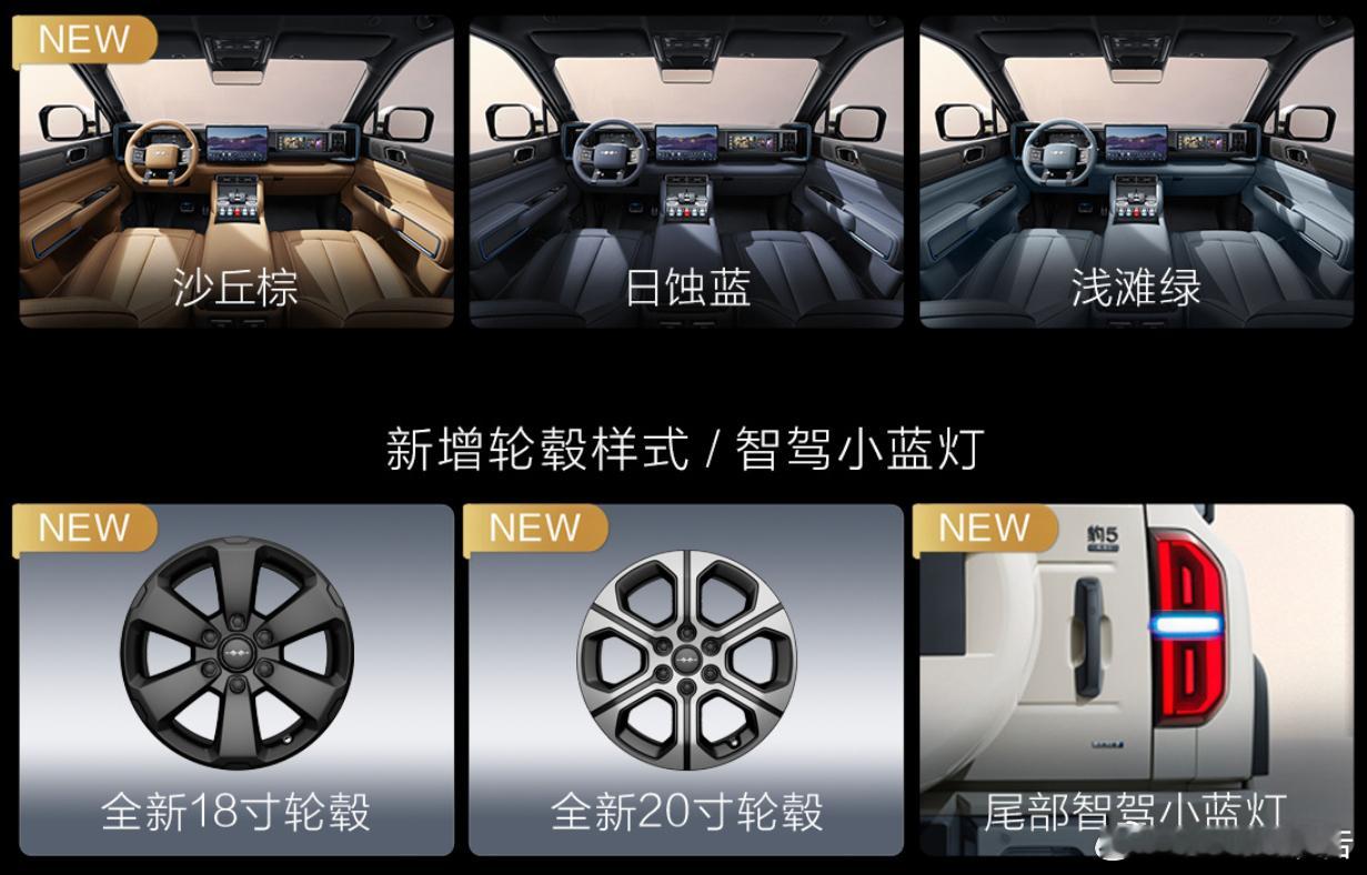 新车一共提供五款车身色、三款内饰配色,新增全新18寸、20寸两种不同样式的轮毂,尾部智驾增加小蓝灯等。
