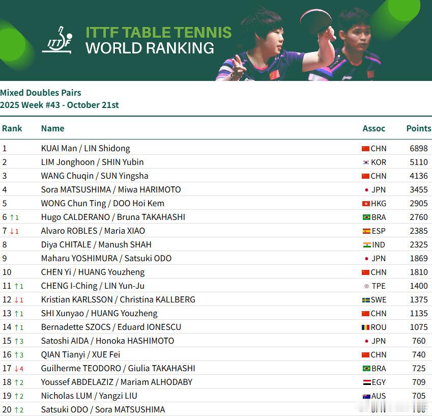 混双:林诗栋/蒯曼第1、王楚钦/孙颖莎第3、黄友政/陈熠第10