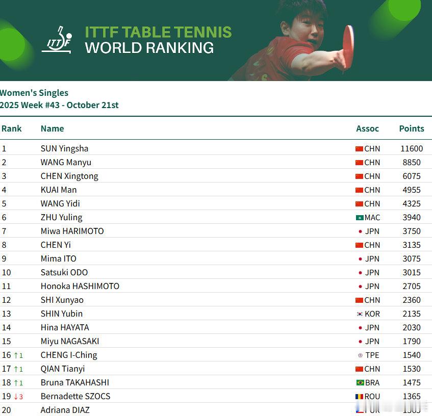 女单:孙颖莎11600分、王曼昱、陈幸同、蒯曼、王艺迪位列前五,陈熠第8