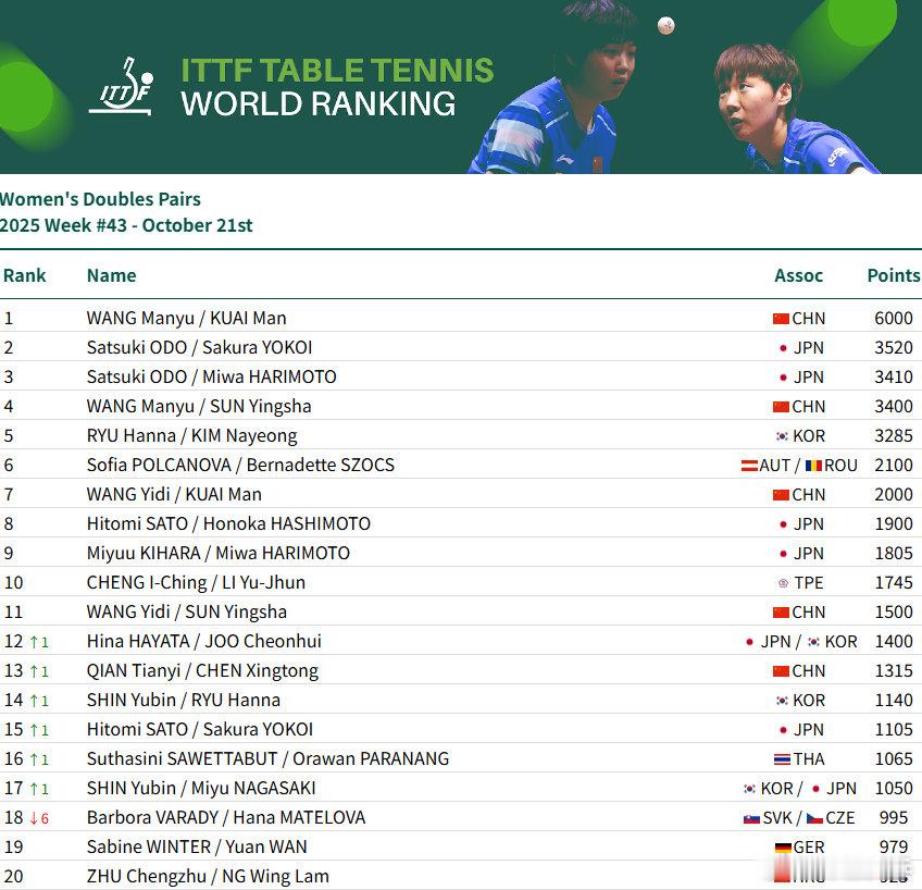 女双:王曼昱/蒯曼第一、孙颖莎/王曼昱第四、蒯曼/王艺迪第7、孙颖莎/王艺迪第11